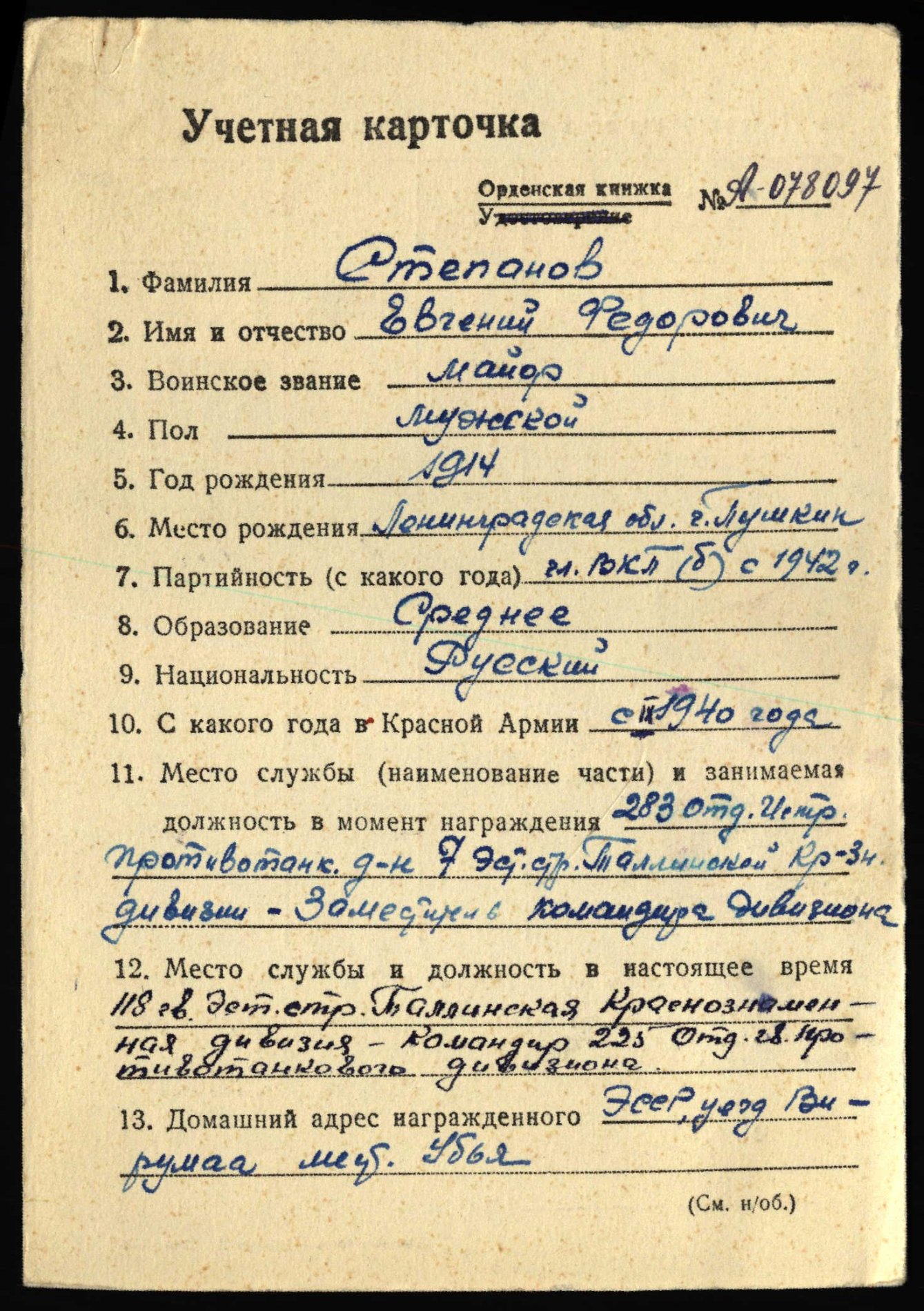 Kapten Jevgeni Stepanov, 7. Eesti laskurdiviisi 283. Üksiku tankitõrje suurtükiväedivisjoni komandöri asetäitja. Isamaasõja II klassi ordeni nr. 428632 kavaler. Stepanov on 1944.a saanud ka Punatähe ordeni, mis kannab numbrit 939421 ja anti talle Emajõe forsseerimise ning Mustvee linna lahingute eest. 1956. aastal autasustati teda veelkord Punatähe ordeniga mis kannab numbrit 3536520, aga seda ilmselt juba Nõukogude armees väljateenitud aastate eest.