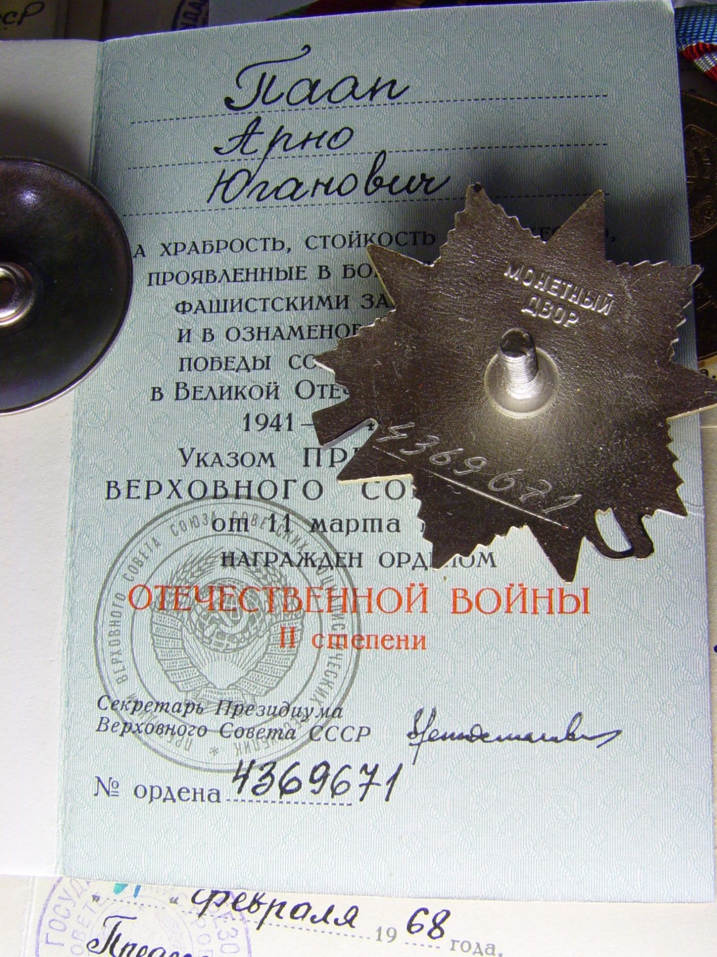 Huvitav ses mõttes, et autasudele vastavalt too võitleja PAAP ei demobiliseerunudki kunagi vaid jäi kuni pensionieani NArmee kaadrisse - "starshinaaks" siis ilmselt // ohvitseriauastet talle vaevalt anti.