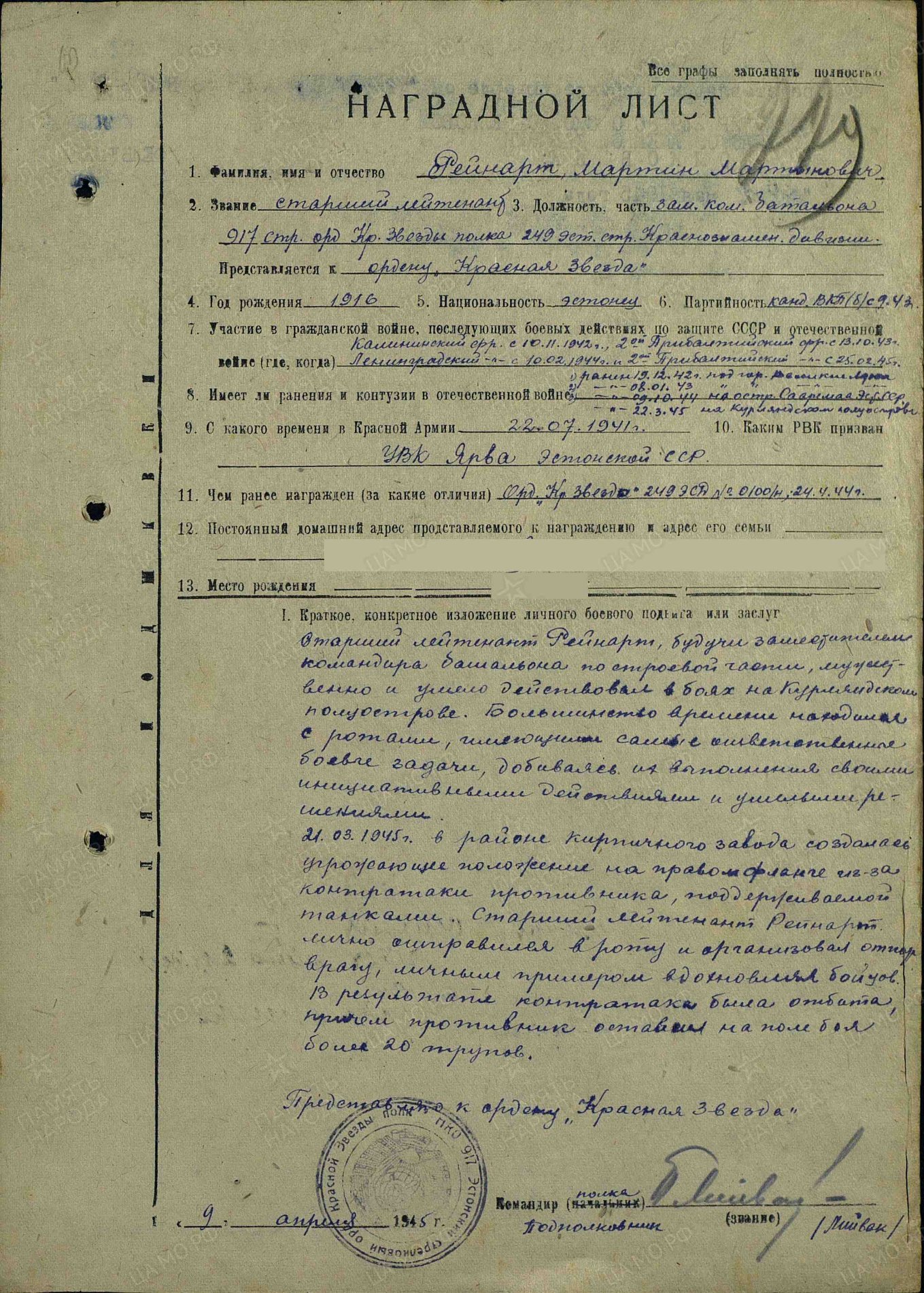 See orden on siin juba varasemalt olemas, aga nüüd on ka tausta kohta midagi teada. Niisiis- vanemleitnant Martin Reinart, autasustamise hetkel 249. Laskurdiviisi 917. laskurpolgu pataljonikomandöri abi, Isamaasõja ordeni II klassi ordeni nr. 450523 kavaler. Reinart on 1944.a saanud ka Punatähe ordeni, selle numbriks on 516437 ja antud Velikije Luki lahingutes osalemise ja haavatasaamise eest.