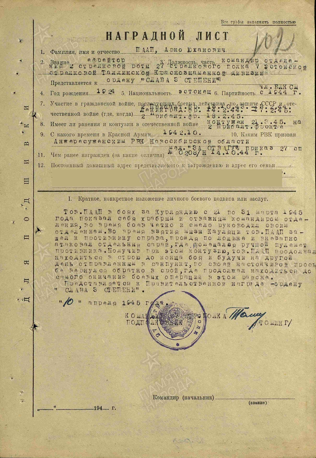 Huvitav ses mõttes, et autasudele vastavalt too võitleja PAAP ei demobiliseerunudki kunagi vaid jäi kuni pensionieani NArmee kaadrisse - "starshinaaks" siis ilmselt // ohvitseriauastet talle vaevalt anti.