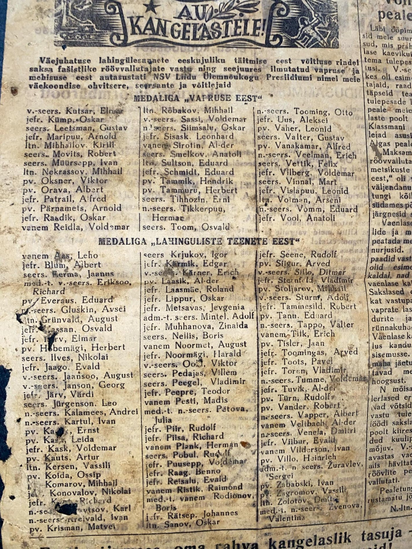 Pildil oleva Vapruse medal (1538568) annetati talle 1944. aasta 8. augustil ja tõlge autasulehelt on nii: