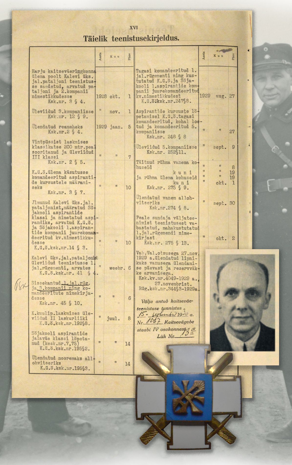 1929. aastal Sõjakooli aspirantide jalaväeklassi lõpetanud ja hilisemale Kaitseliidu Tallinna maleva üksiku raudteepataljoni rühmapealikule Heinrich Velgale kuulunud rinnamärk.