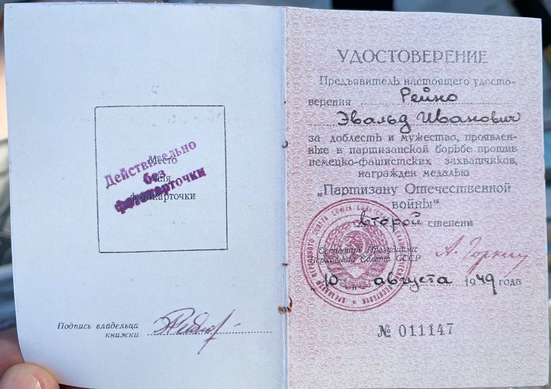 Foto Evald Reino II. klassi partisanimedali tunnistusest.
