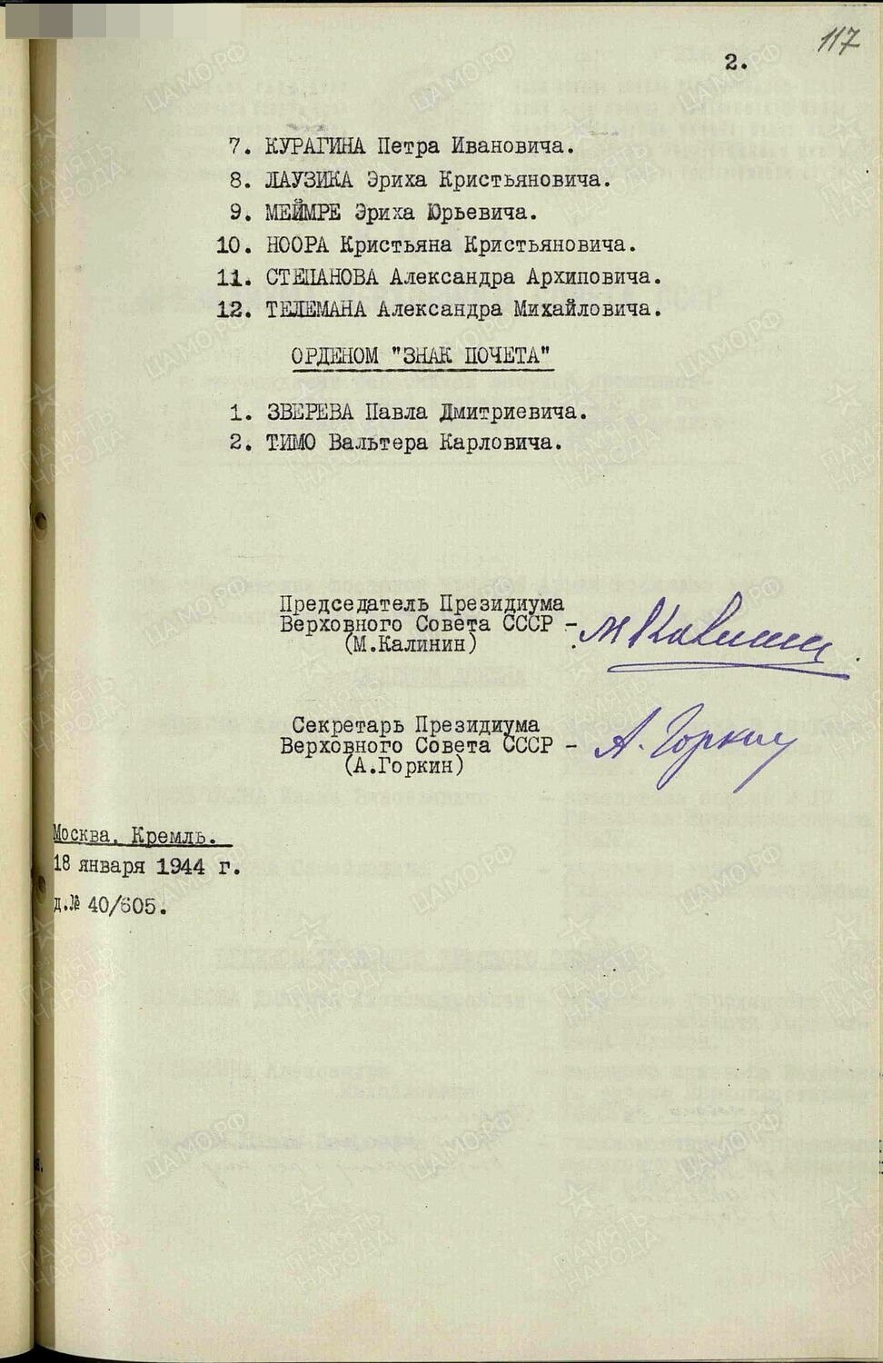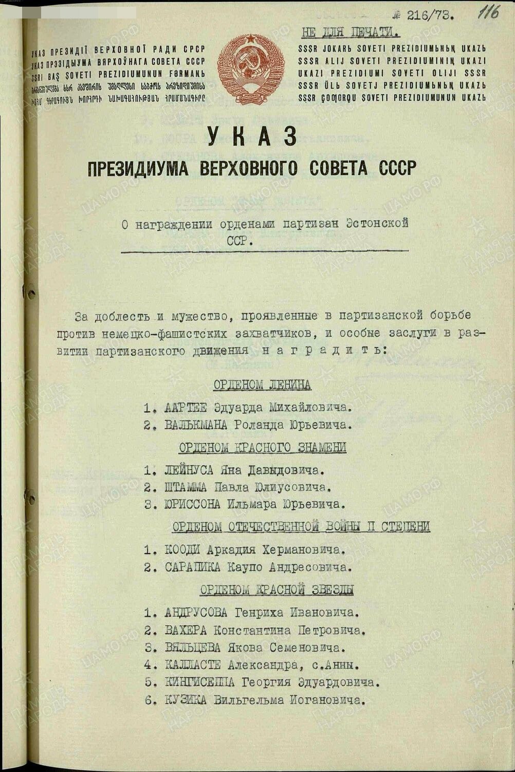 Varasem, 1944. aastast pärit NSVL Ülemnõukogu korraldus ENSV partisanide autasustamise kohta.