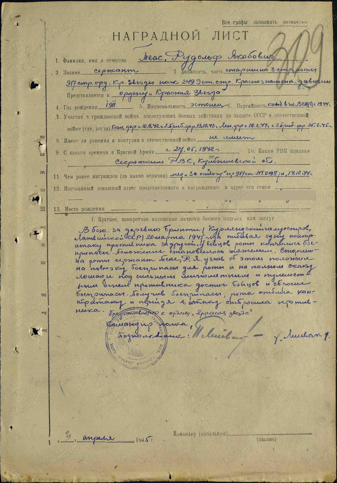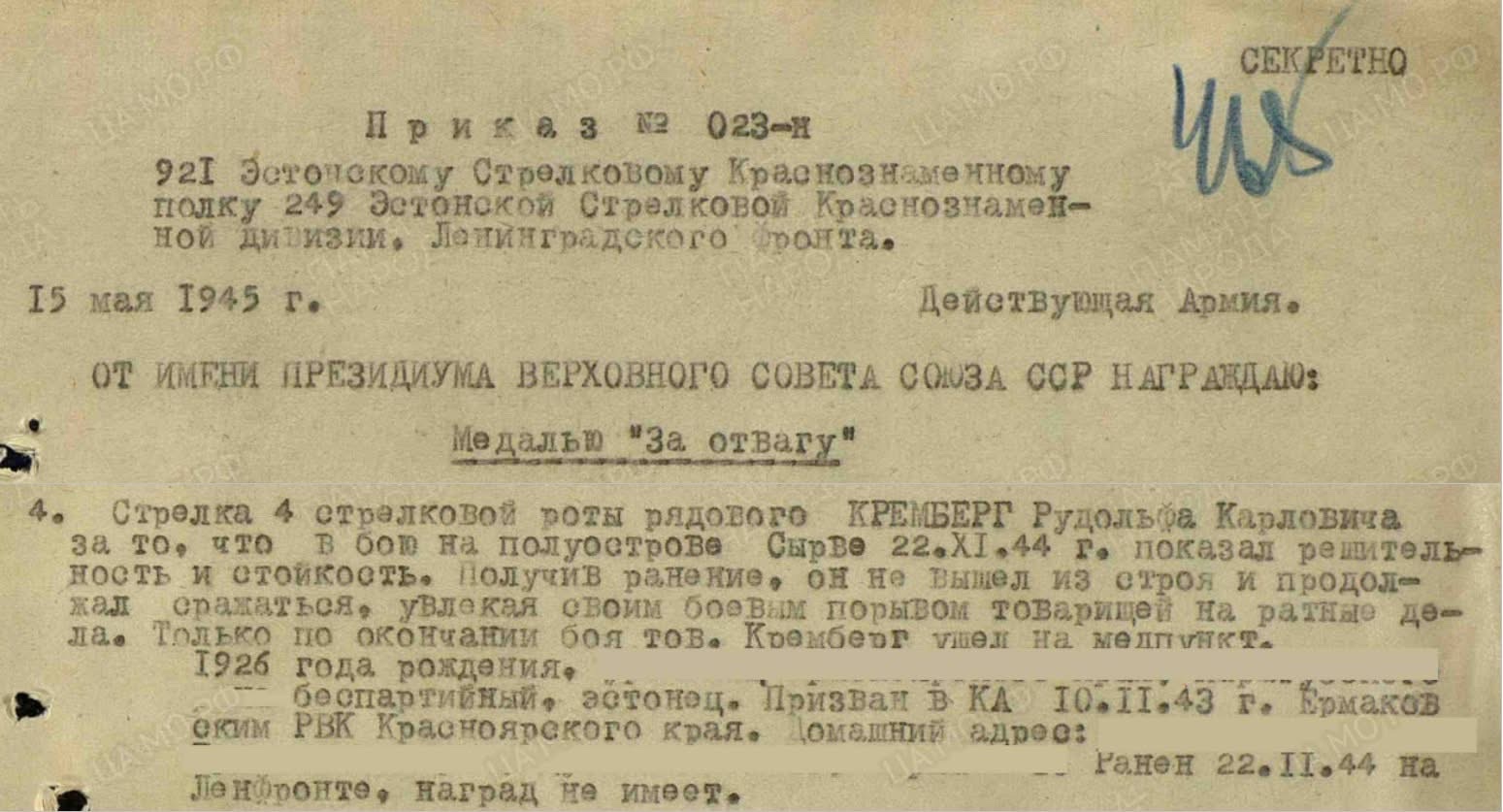 Vapruse medali(1538094) ja lahinguteenete medali(2893085) kavaler. Vapruse medal saadud Saaremaal ja lahinguteenete medal Kuramaal.