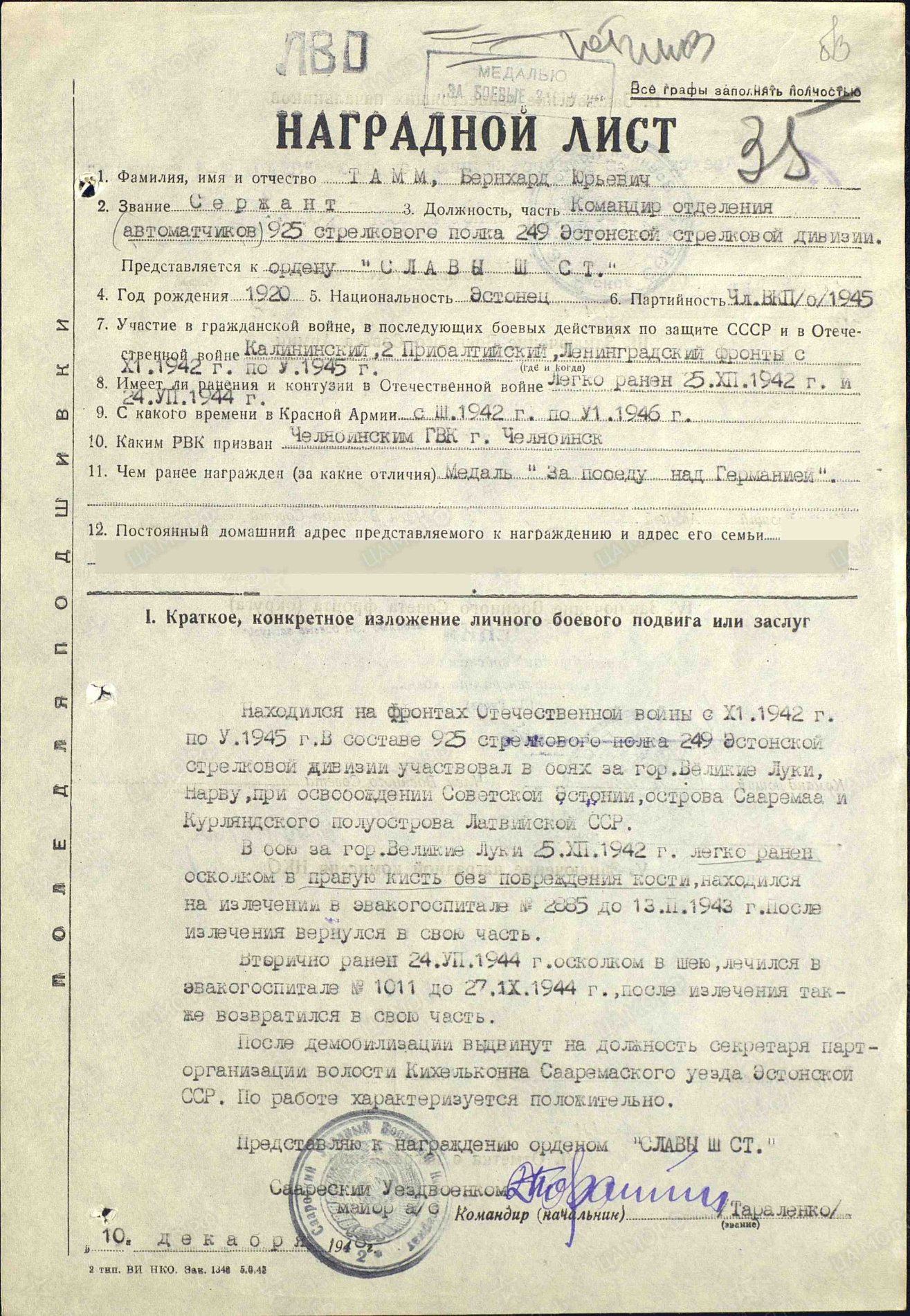 Lahinguteenete medali kavaler Bernhard Tamm, 249. Eesti Laskurdiviisi 925. laskurpolgu automaaturite jaoülem. Esitati Kuulsuse III klassi ordeni saamiseks, aga anti hoopistükkis Lahinguteenete medal.