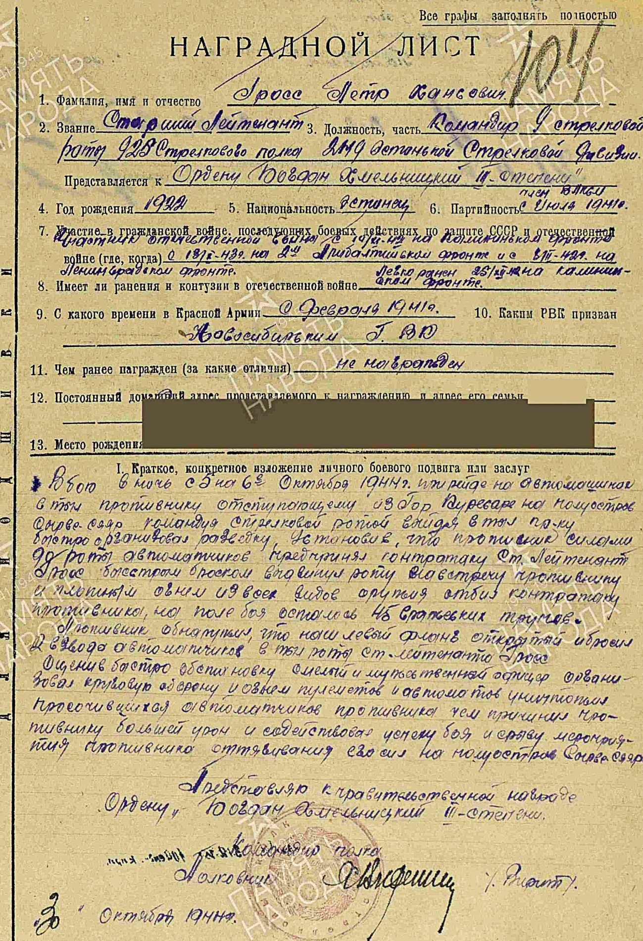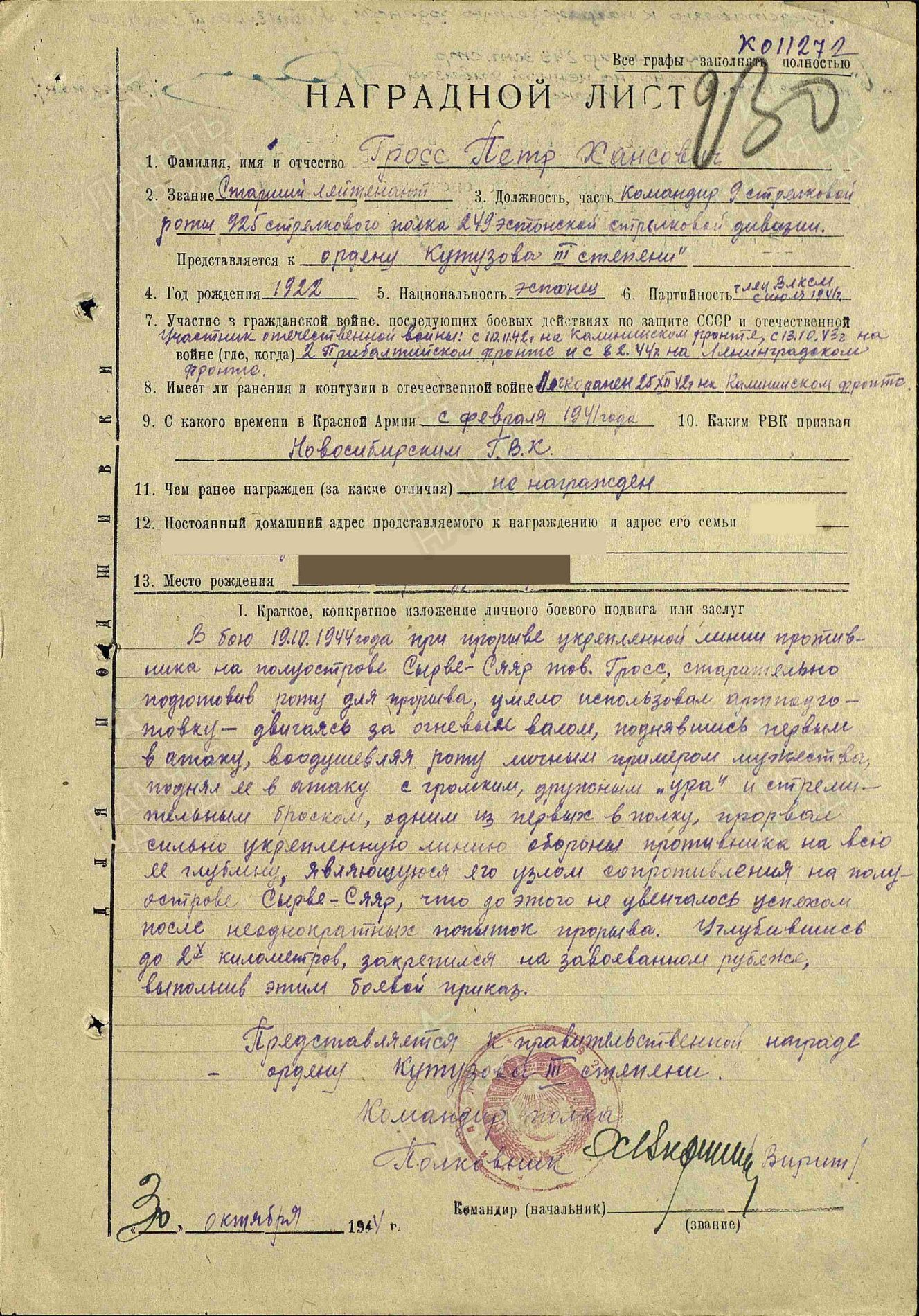 Vanemleitnant (autasustamise hetkel) Peeter Gross. 249. Laskurdiviisi 925. laskurpolgu 9. laskurroodu komandör. Isamaasõja I klassi ordeni nr. 67692 ja Aleksander Nevski ordeni kavaler.