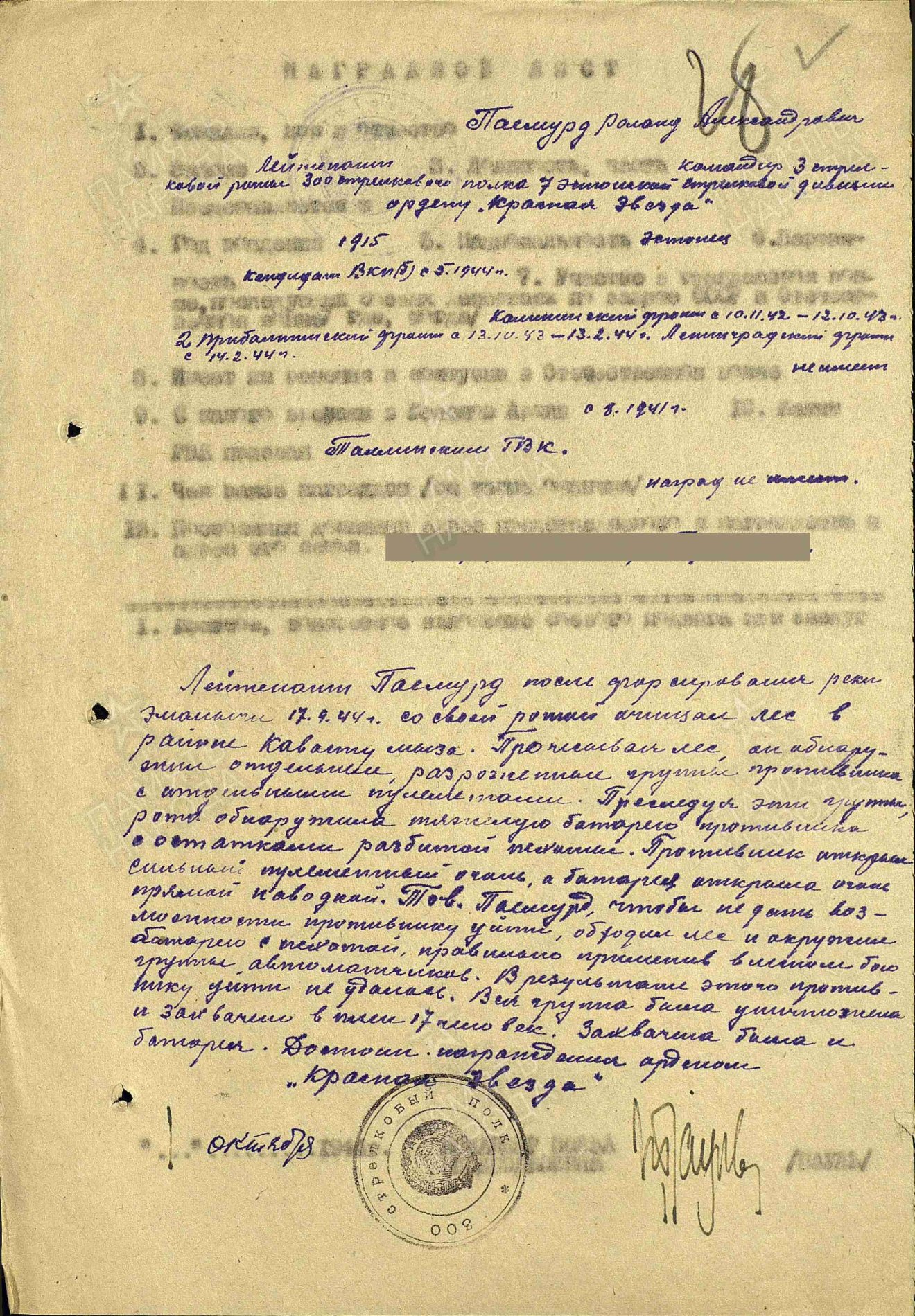 Vanemleitnant Roland Paemurd(7. LD, 300. Laskurpolk). Autasustatud Punatähe(843618) ja Aleksander Nevski Ordeniga(21277).