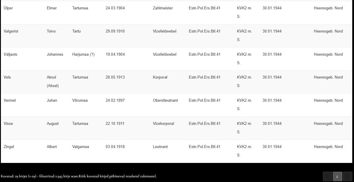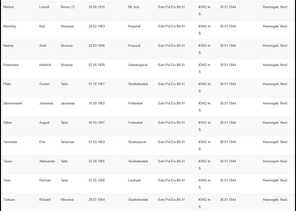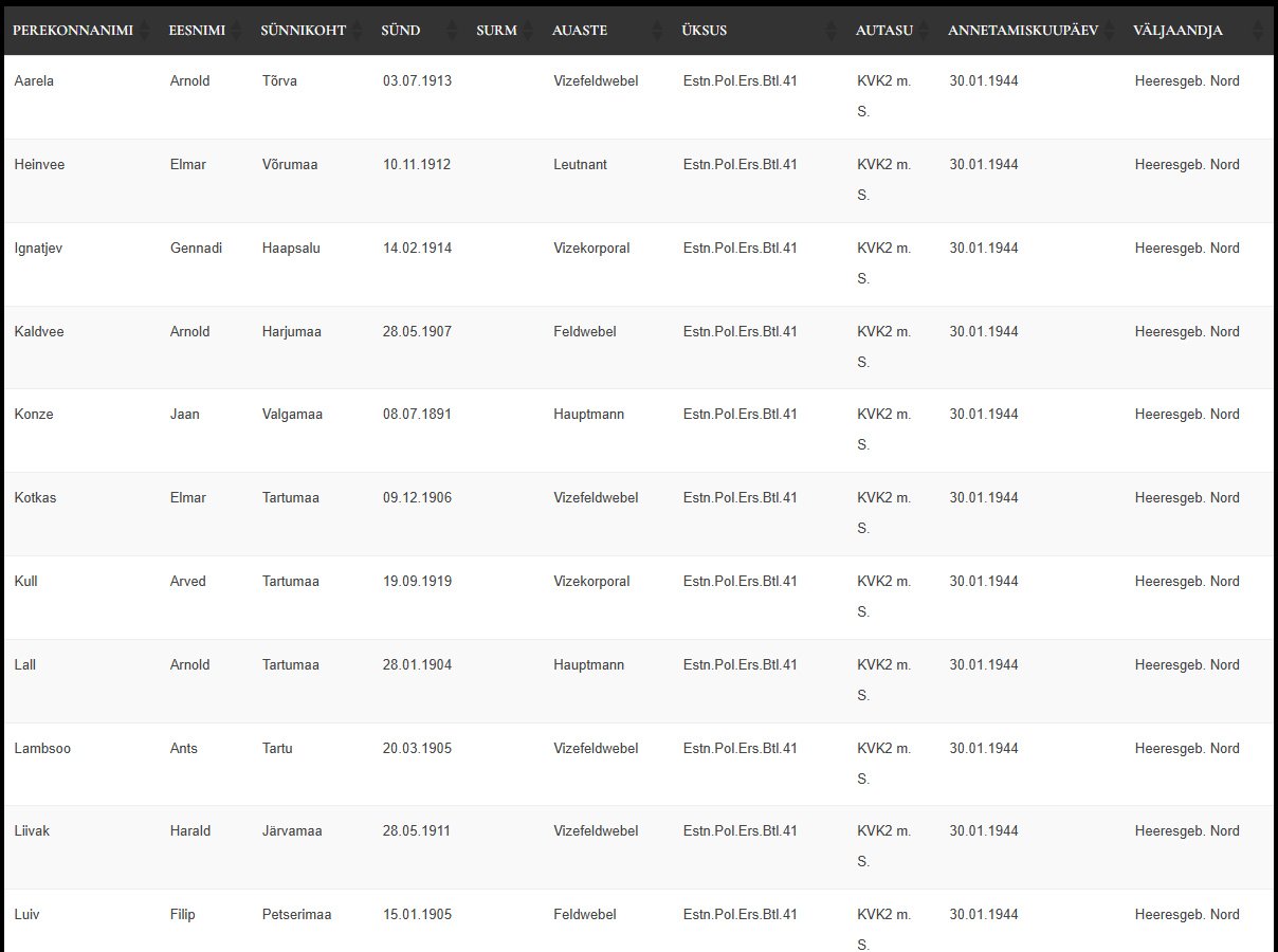 Paar kuud tagasi laadisin lehele üles ka Sõjateeneteristiga auatasustatud eestlaste andmebaasi. Kogu andmestik põhineb Bundesarchiv'i dokumentidel ja sisaldab peamiselt Eesti Omakaitse üksuste ning Ida- ja Kaitsepataljonide liikmeid. 20. Eesti SS diviisi sõjameeste kohta leidus dokumente väga vähe. Kokku on nimekirjas peaaegu 3000 nime, nende hulgas oli mäletamist mööda ka vist isegi paar naisterahvast.