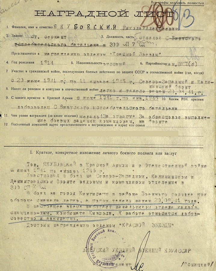 Nikolai Jakubovski ei olnud papist poiss... neljakümne esimesel vabatahtlikult hävituspataljoni, siis 300. Laskrpolk, pärast kursandiks ja seersandi paelad peale. Minu meelest eriti huvitavad sissekanded on Laskurkorpuse karistusüksuses teenimise kohta, alguses 1942. aastal, hiljem 1943-1944, siis juba nagu aru saan jaokomandörina. Ja huvitavamaks läheb- 44 aastal teenis mees juba ENSV partisaniliikumise staabis 2. roodu jaokomandörina.