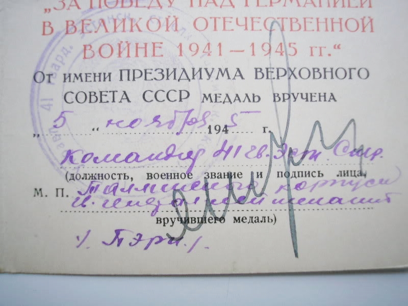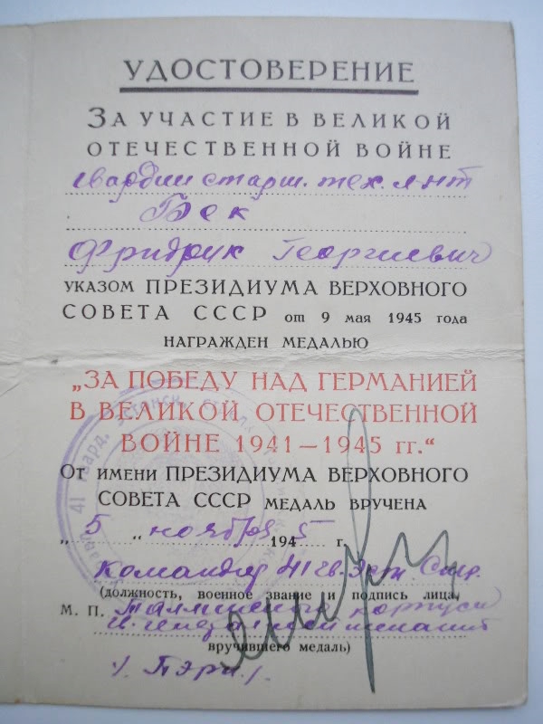 Nüüd aga Kindralleitnant Lembit Pärna allkirja kandev tunnistus medalile Võidu eest Saksamaa üle. Medali on saanud kaardiväe vanemleitnant Friedrich Bek.