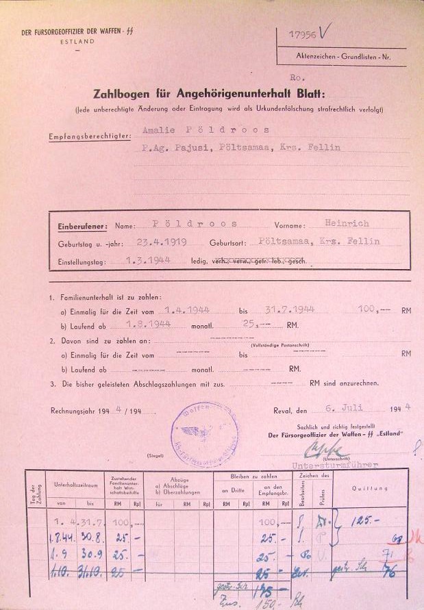 Kas see pole mitte SS hooldusohvitseri kaudu makstud teenitud palk (abikaasa või sugulase) Amalie Põldroosile?