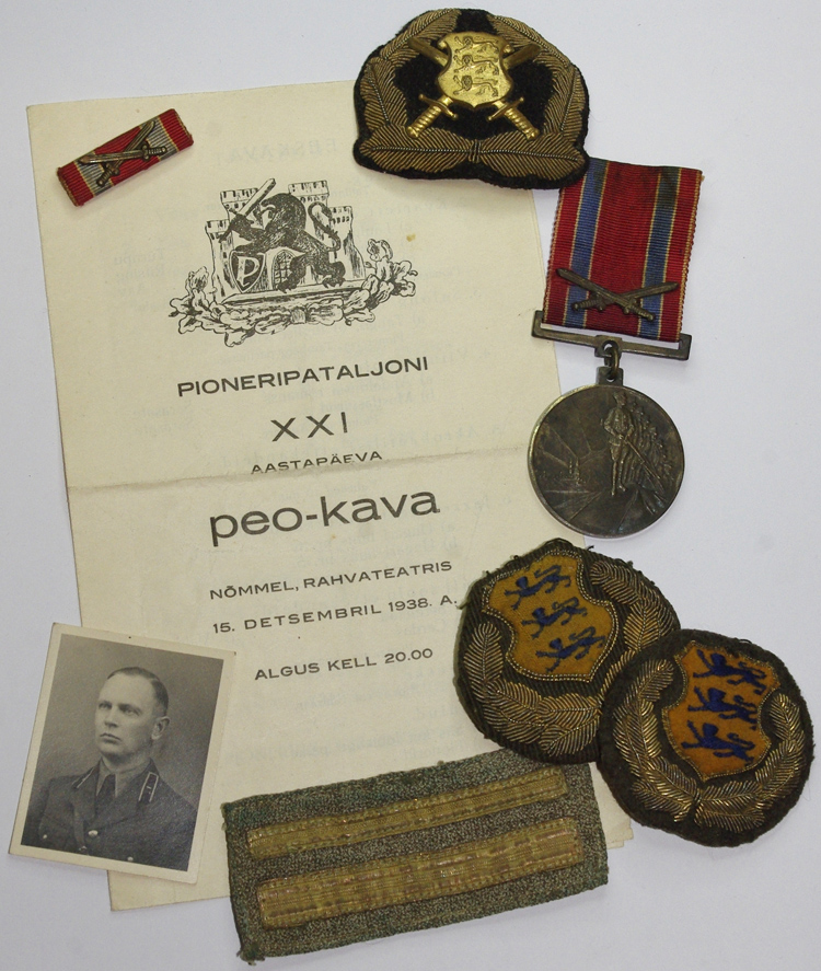 Pioneerpataljonis teeninud major Erich Möldre vormikuue eraldusmärgid, mütsimärk ja "10 aastat Läti Vabadussõjast" mälestusmedal.
