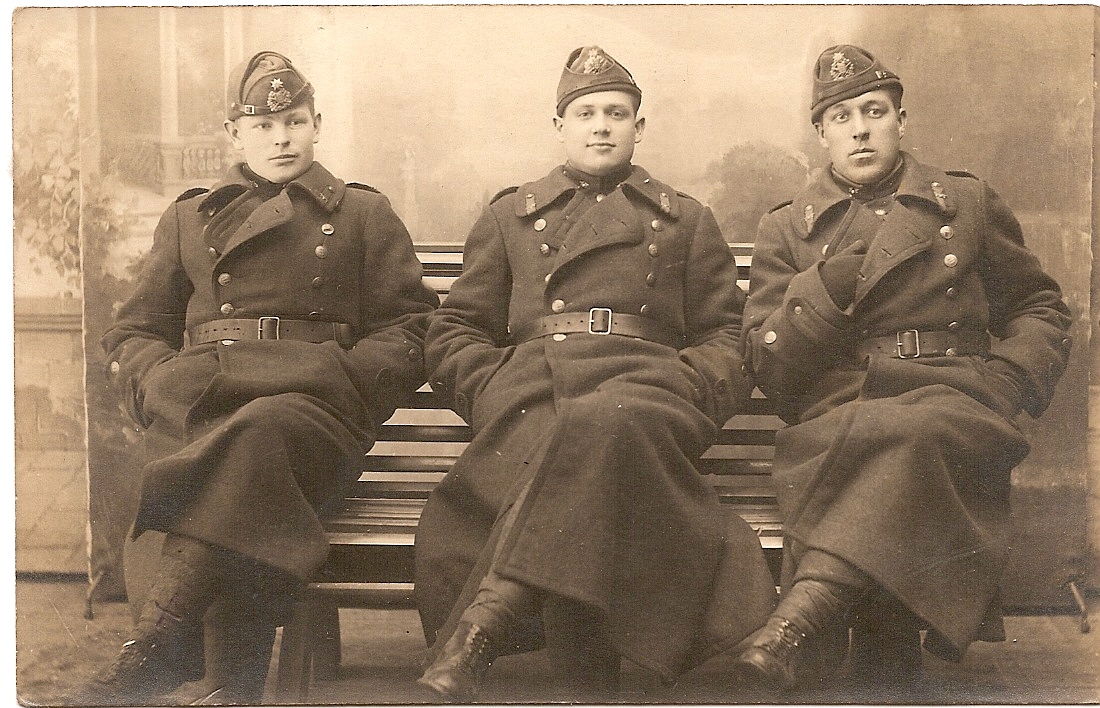 pakun välja, et tegemist on aastatega 1926-27. Meestel tunduvad seljas olevat veel M24 sinelid, kindlasti on vasakpoolsel mehel vana malli talvemüts. Keskmise mehe paguneid pole näha, aga kapteni jaoks on ta väga noor, pealegi peaks tema vöörihm olema õlarihmaga. Seega - pigem ajateeniajte grupipilt.