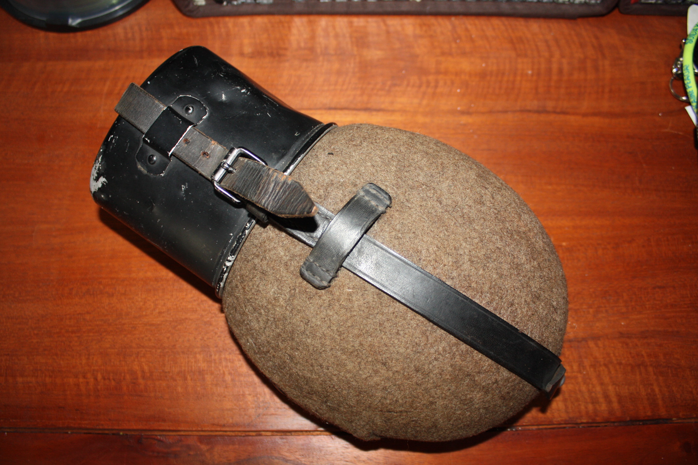Ühe Eestimaa vanaisa kapist ilmus välja veel üks täiesti kasutamata troopikapudel. Markeeringud putlil ja topsil HRE42, rihmade metallosad ja minu kogus esmakordselt tembeldatud nahkrihm HRE43. Pudelilt pesin "paatina" maha, sest tundus ebahügieeniline teist puudutada, rihmad jätsin nii, nagu nad aastakümnete jooksul olnud on- pandlalt väike roostetriip ja joogitopsilt alumiiniumijälg tekstiilile külge hakanud. Asi tuli osta.ee-st, kesise majandusliku seisu tõttu panin automaatpakkumisse suht väikese numbri ja üllatusena keegi sellest üle ei pakkunudki. Et tegemist täiesti minty pudeliga, selgus alles siis, kui seda oma käes hoidsin.