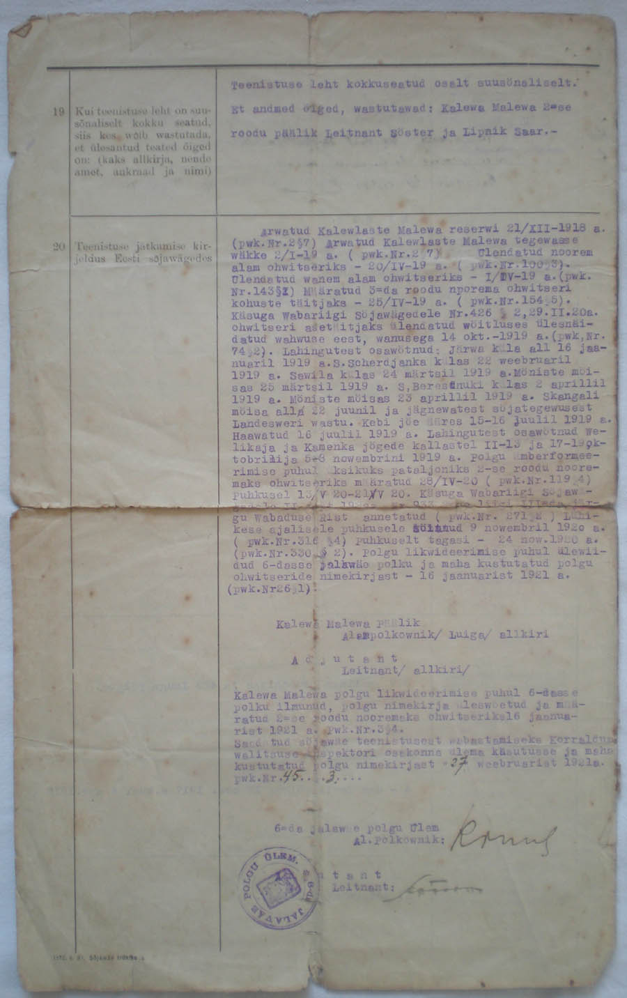 Kehvas seisukorras aga huvitav teenistusleht, kus kirjas ohvitseri asetäitja Arnold Belials'i teenistuskäik.