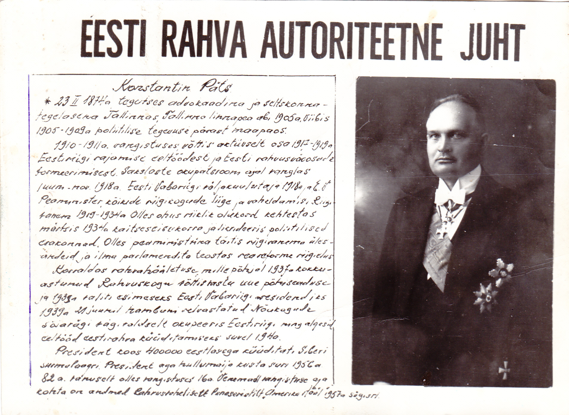 Nõus - mul omalgi 80 keskelt Pätsi foto. Sai klassivennalt pilt saadud ja siis oma fotolaboris koopia tehtud. Minu variant oli ainult pilt, ilma mingi tekstita.divine kirjutas:Meie tänased teadmised ja 30 aasta tagused pole võrreldavad ega ühtse pildina vaadeldavad.