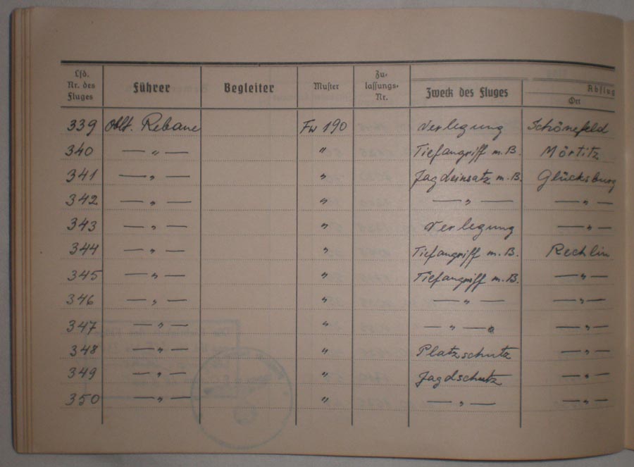 Kokku on sinna märgitud 352 lendu ja viimased 2 sissekannet on 30. aprillist 1945. Sellel päeval oli Rebasel kaks lendu, esimesel lennul sai ta rattad maast lahti kell 10.20 hommikul ja maandus 11.25, lennu iseloomuks on pandud Tiefangriff ja märkmete lahtris on kirjas, et õhulahing nelja Jak-3'ga. Selle päeva teine ja ühtlasi kogu Luftbuch'i viimane sissekanne on tegelikult lend Rootsi, õhkutõusmine 12.10 ja maandumine 13.15 Bulltofta, Rootsi. Selle lennu märkmete lahtrisse on kirjutatud "das Krieg ist zu Ende!".