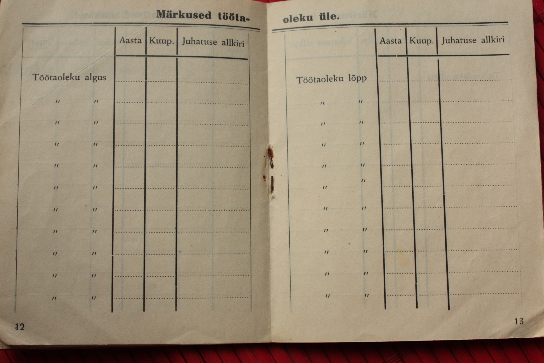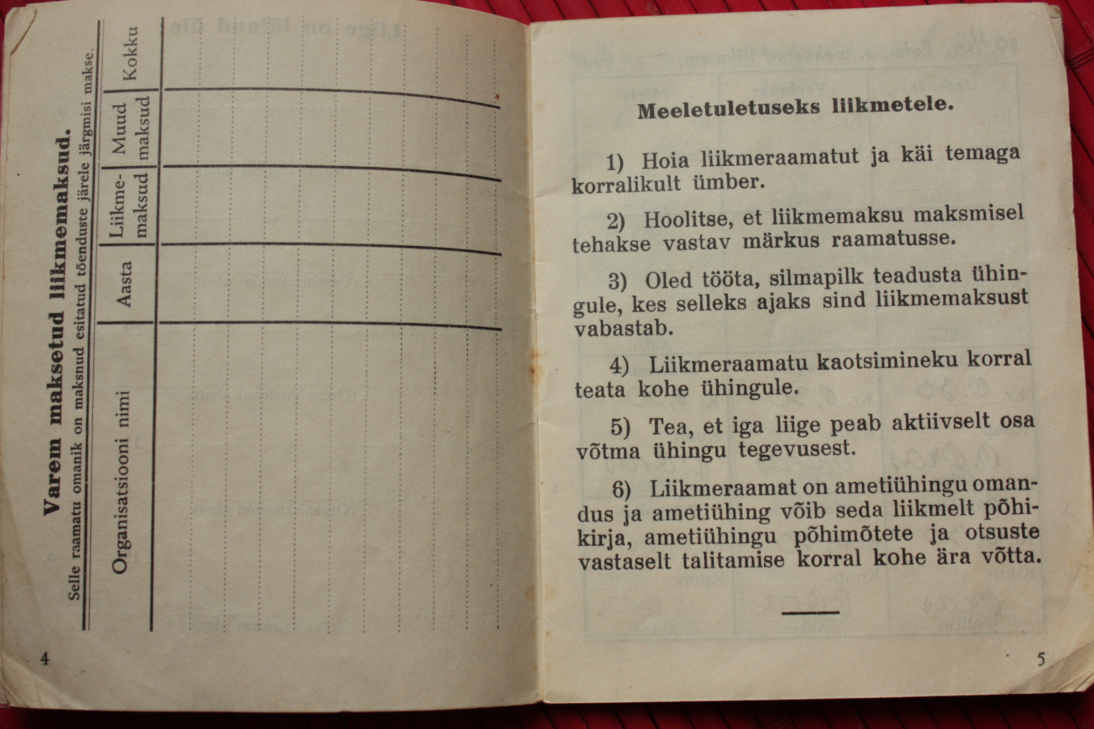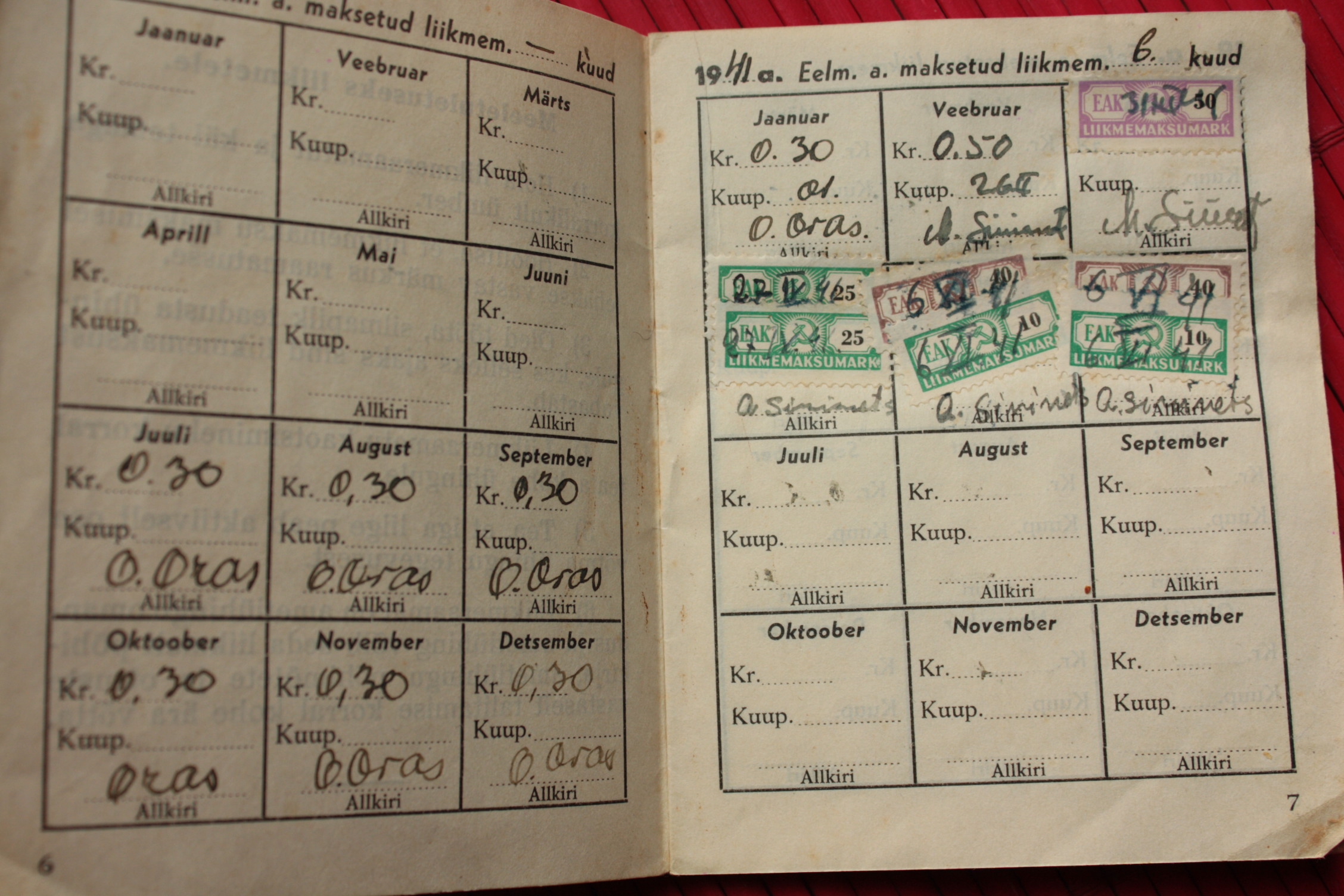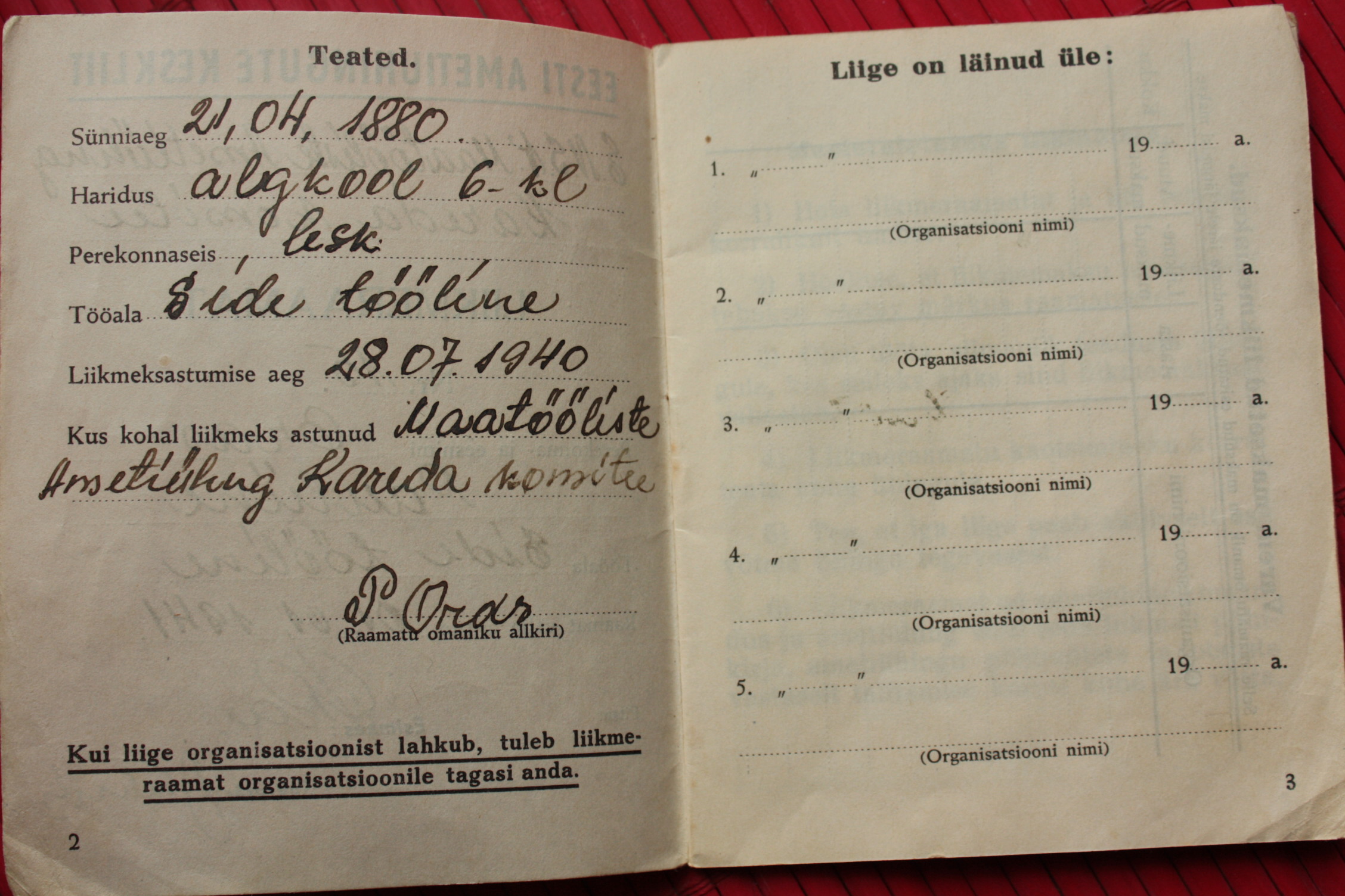 Ametiühingu liikmepilet. Trükitud natsionaliseeritud A. Nõmpere trükikojas 1940. aastal. Rahadena on käibel veel kroon ja sent. Juulist 1940, mil dokumendi omanik AÜ-ga liitus, kuni jaanuarini 1941 on igakuine liikmemaks olnud 30 senti, alates veebruarist 1941 juba 50 senti. Mais on liikmemaks mingil põhjusel tasumata jäänud, see-eest roobiti juunis kohe topelt. Nagu näha, siis juulis enam organisatsioon endise jõuga ei töötanud, vähemasti pole liikmemaksu enam korjatud. Tea, kas AÜ liikmelisus oli sel ajal teataval määral sunduslik?