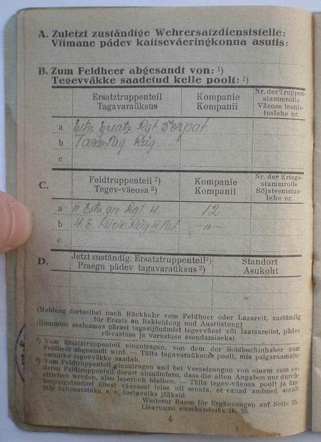 Olen näinud ühte, mis antud Sicherheitspolizei 1. pataljoni võitlejale ja olen täiesti kindel, et jagati selliseid ka ED meestele (kuigi hetkel mul ei meenu, et oleksin ise näinud).Kriuks kirjutas:Kas selliseid säästu-Soldbuch'e jagati ainult piirikaitserügementidele või kõlbasid need ED tarbeks samuti?