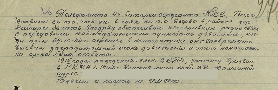 Kokku autasustati Narva jõe forsseerimislahingute eest 249. laskurdiviisist 56 suurtükiväelast "Lahinguliste teenete eest" medaliga. Kas see tähendab, et juba sõja ajal jagati nummerdamata medaleid ja kui siis mis tingmustel (kiire autasustamine?)?