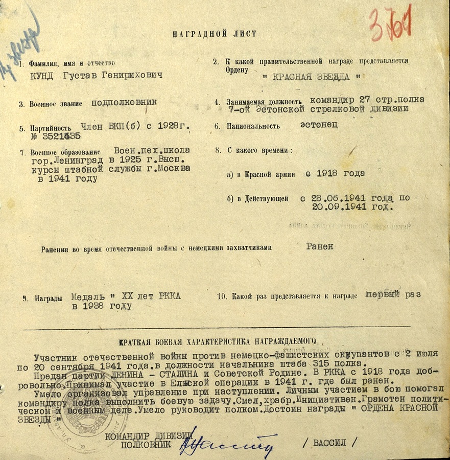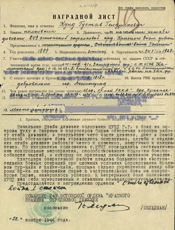 polkovnik Gustav Kund, 249. eesti laskurdiviisi staabiülem. Isamaasõja I / II klassi, Punatähe ordeni ja medali 20 aastat tööliste / talupoegade punaarmeed kavaler.