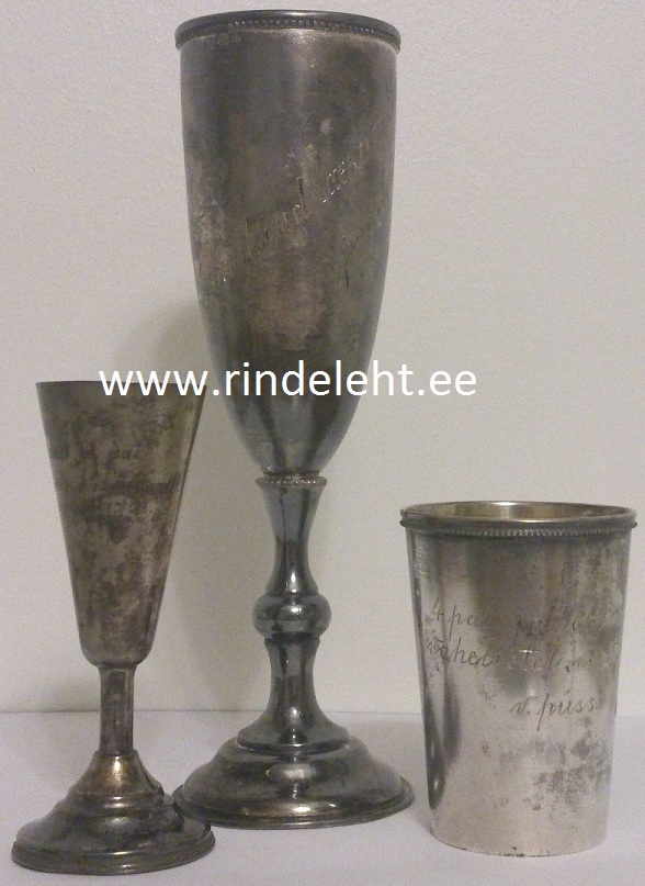 Ühele 4. Üksik Jalaväepataljoni majorile kuulnud esemed - laualipu varras ning hõbedast pits, karikas ja tops.