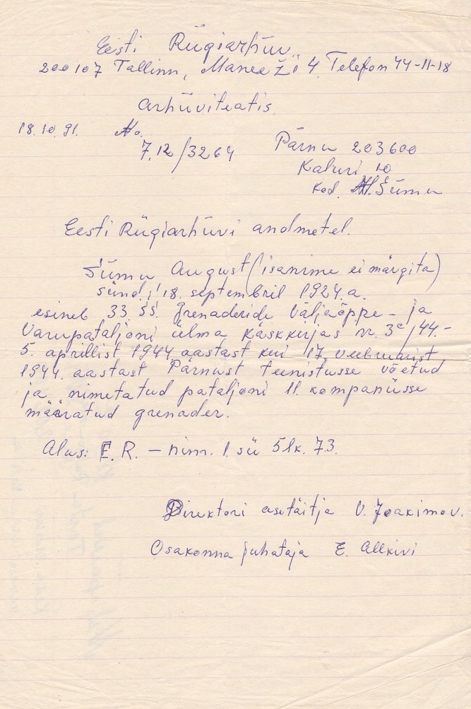 Augusti omakäeline ER arhiiviteatise ümberkirjutus (mehe sünniaeg miskipärast vale - õige on 05.05.24) ...