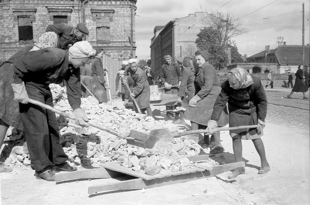 Narva maantee ja Maneeži tänava nurgal asunud hotelli Room varemete koristamine pärast sõda.