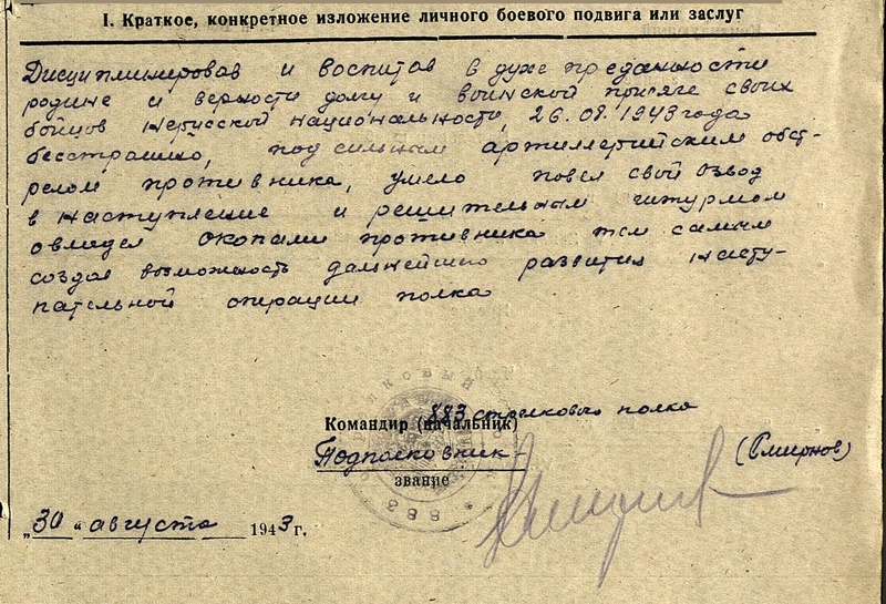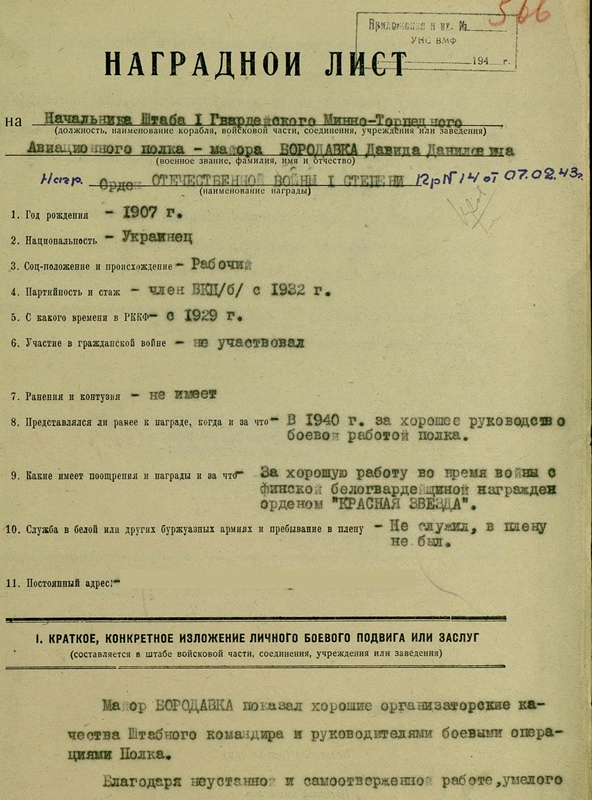 Autasustati teda takkajärele 1941.a suvel toimunud Porhovi lahingu eest - autasustamisleht on vormistatud 1943.a dets. ja kinnitatud 1944.a jaan. seisuga.