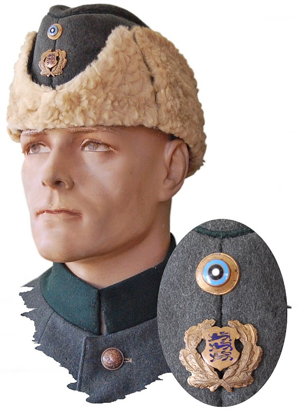 Jalaväe allüksuse mütsil Tallinna kokard, halli kandiga ratsaväe allüksuse talvemütsil Harju maleva kokard.