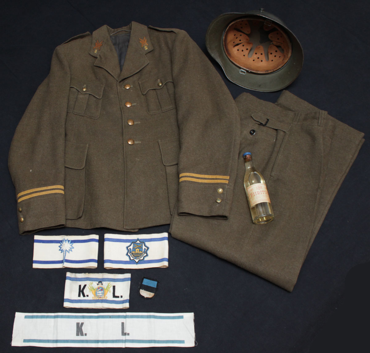Kaitseliidu lintidest on natuke teistsuguse tegumoega see kõige alumine - õhukesele riidele on trükitud sinised triibud ja tähed. Kas 39/40 aastate teema? Ülejäänud lindid on nagu lindid ikka - Tartumaa, Viru ja Narva malevad.