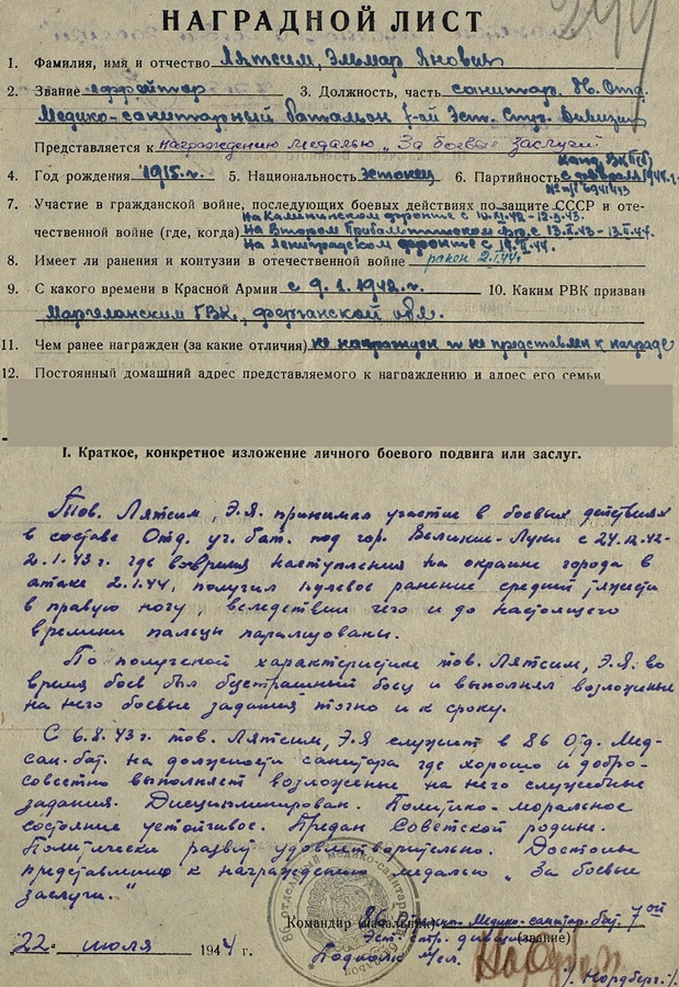 7. Laskurdiviis, 86. Üksik meditsiinipataljon, jefreitor Elmar Lätsim. Kahe Lahinguteenete medali kavaler ( millest viimane on kahjuks kadunud ). Teekond standartne Velikije- Luki- Kuramaa. Ja kõik see muu, mis sinna vahele mahtus.
