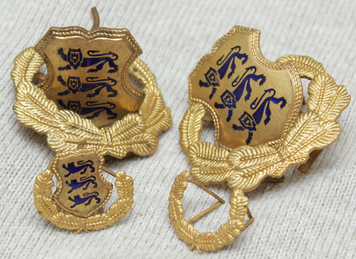 Eesti ohvitseri vormikuue varrukamärgid ja vormipluusi tarbeks mõeldud väikesed variandid. Ivalo poolt EW sõjaväe peakatete teemasse postitatud pilotkal samasugune väike riidest embleem mütsi ees, võimalik et mütsimärkidena võidi kasutada ka siis neid vormipluusi metallist märke. Kahjuks on mul täiskomplektist üks väike kilp puudu. Äkki on kellelgi üle?