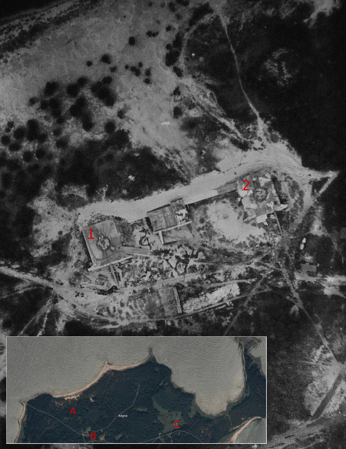 Väiksemal kaardil on märgitud: A - Aegna sadam, B - Ohvitseride kasiino ja C - 3. Rannapatarei asukoht