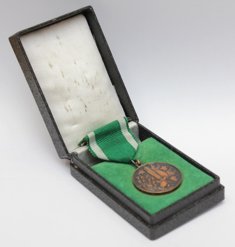 1939. aastal loodud Läti kaitseliidu autasu eeskujuliku/ustava (?) teenistuse eest. Tulenevalt 1940. aasta sündmustest ja okupatsioonist jõuti medalit välja anda ainult kahe aasta vältel - kokku mõnisada autasustamist (selle info leidsin internetist ja ei tea kui tõene see on). Konkreetne medal on annetatud ühele KL Tallinna maleva Toompea malevkonna ohvitserile.