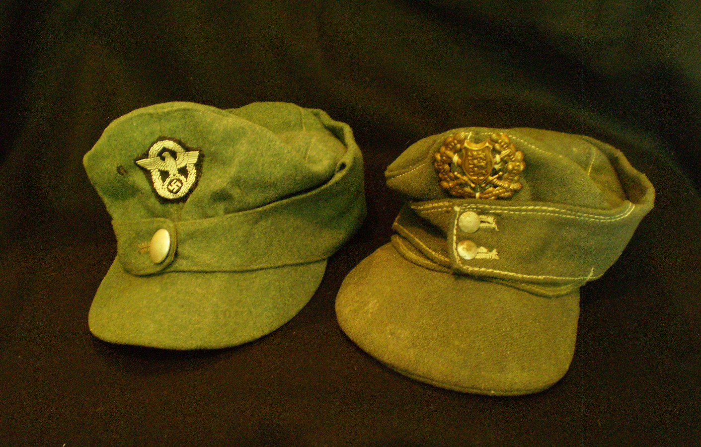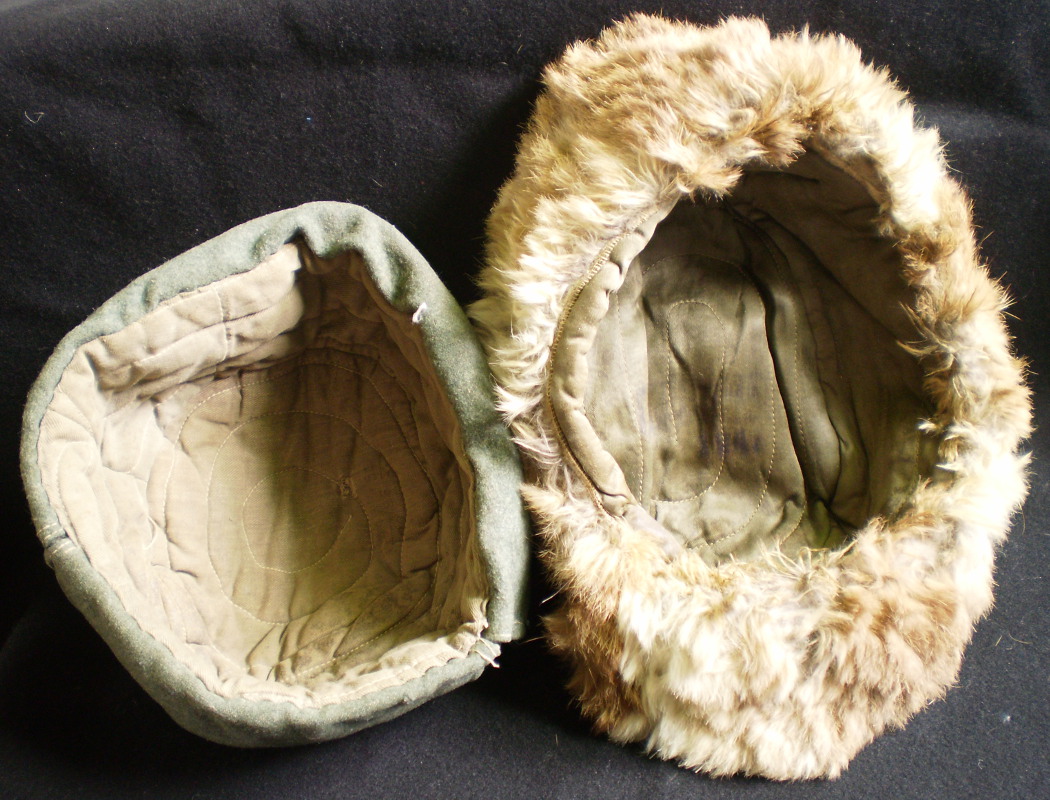 Vasakul ss sinelist tehtud vene ushanka stiilis talvemüts. Ära harutatud kotka tiiva õmblus on vasakul klapil näha. Paremal tüüpiline määrustikupärane talvemüts jänesenahst. Aasta paistab olevat sees 1942.