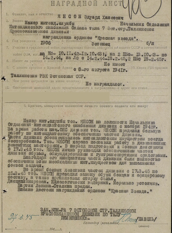 Major E. Jaanson oli lühidalt öeldes 7. Eesti Laskurdiviisi tagala osakonna intendanditeenistuse ülem. Väga väga heas seisukorras Punatähe ordeni numbriks on 1480488.
