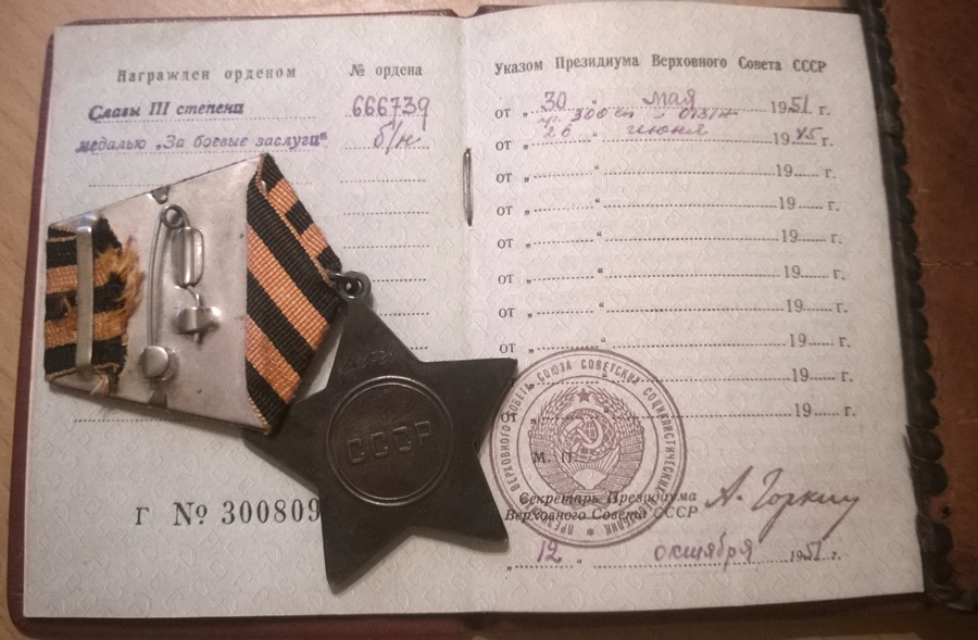 Ostast läbi käinud nooremseersant Vladimir Tisler'i Vapruse medal. 249. Laskurdiviis 921. Laskurpolk. Leningardi rinne- Duderhof- Narva- Saaremaa. Medal on saadud tagantjärele, ilmselt kaheksakümnendatel aastatel ja selle eest, et Tisler sai 1944. aastal raskelt haavata.