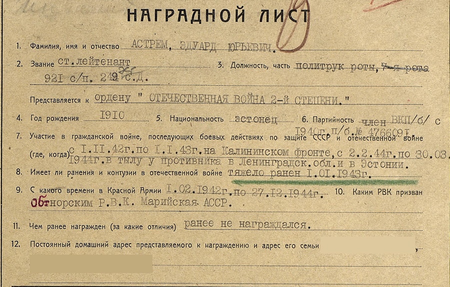No ja lisame ka sellise mehe, nagu vanemleitnant Eduard ASTREM. 921. Laskurpolk. 1943-ndal aastal sai Velikije- Luki lahingutes jalga haavata, mille järel oli Ivanovo linnas haiglas. Pärast, kui ta riviteenistuseks kõlbmatuks tunnistati läheb asi huvitavamaks…