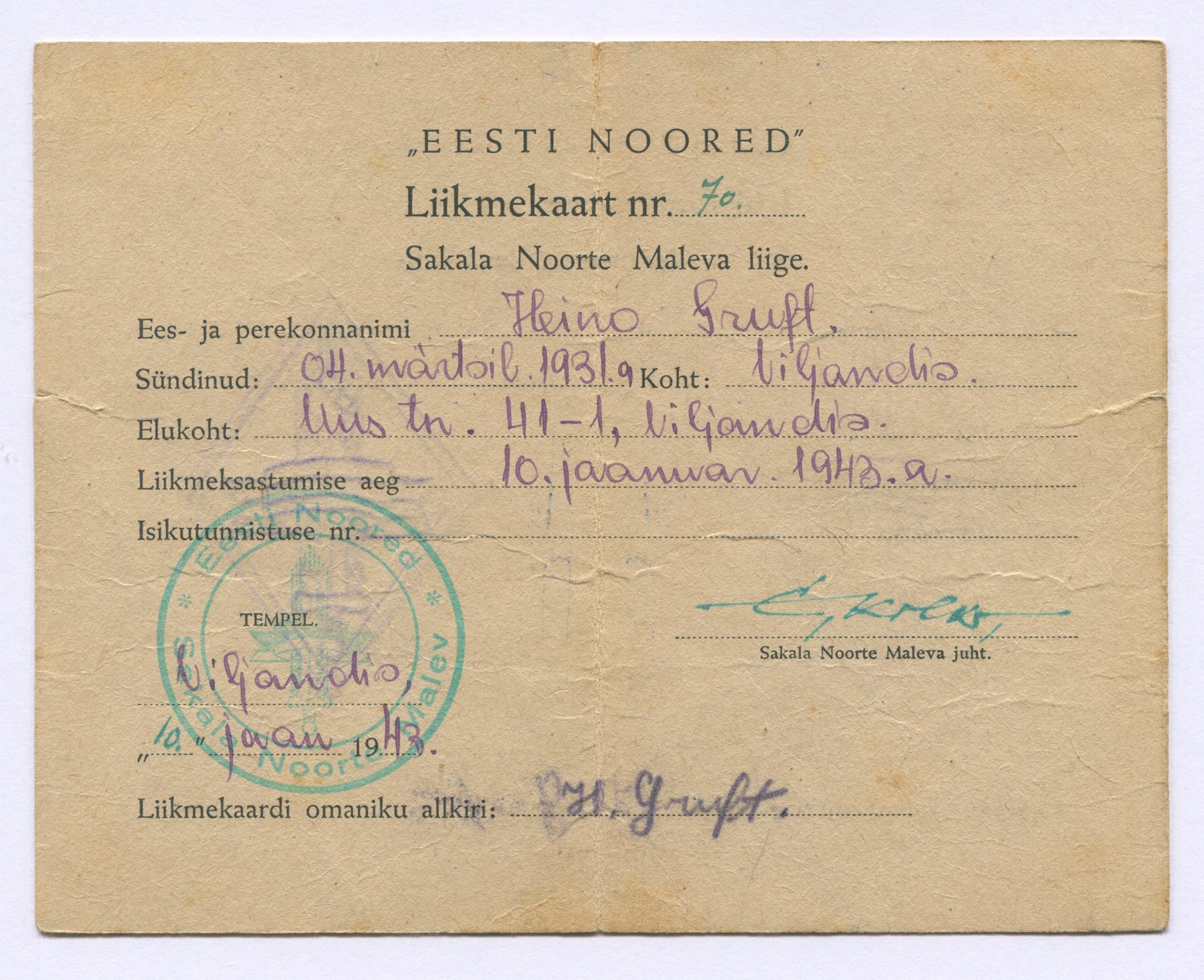 EN Sakala Noorte Maleva liikme, Heino Gruft'i EN liikmekaart, Katsete Sooritusraamat ja veel üks paber.