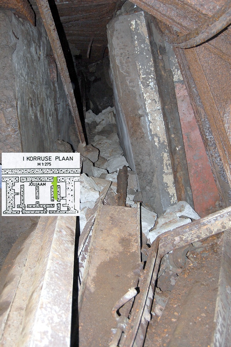 Ennesõjaaegne ülesvõte parempoolsest ruumist, skeemil on märgitud punasega. Pildil näha olev ukseava on jõujaama vaheseinas ning ühendas kahte generaatoriruumi (skeemil valge kuubik rohelise ja punase ristküliku vahel).