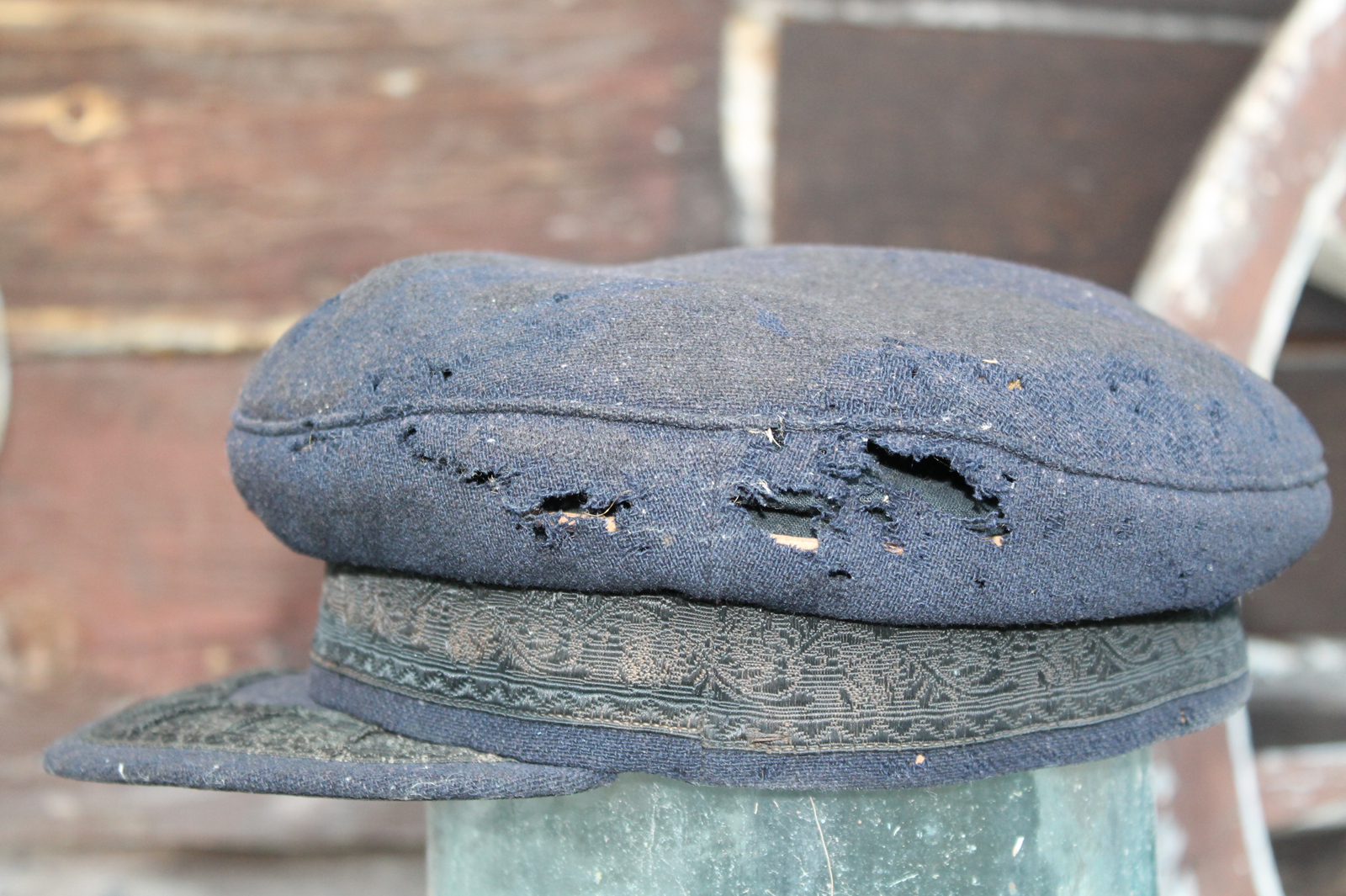 Kas tavakodaniku uhke peakate olnud või oli äkki meremeeste peakate.Tormirihma nöödi kohad on näha ja jupike niiti ka.