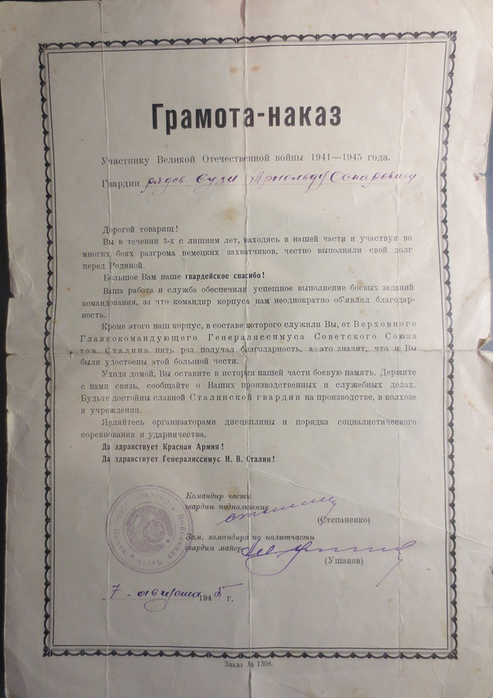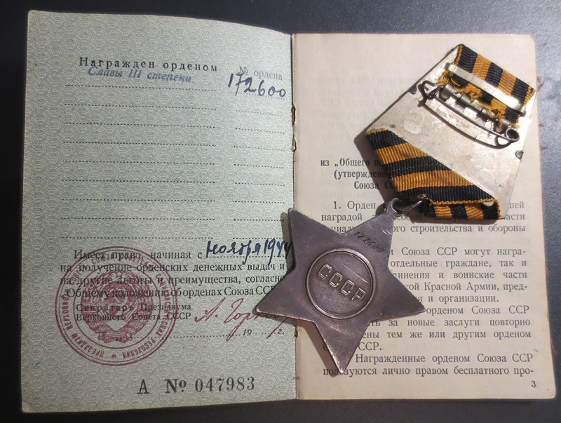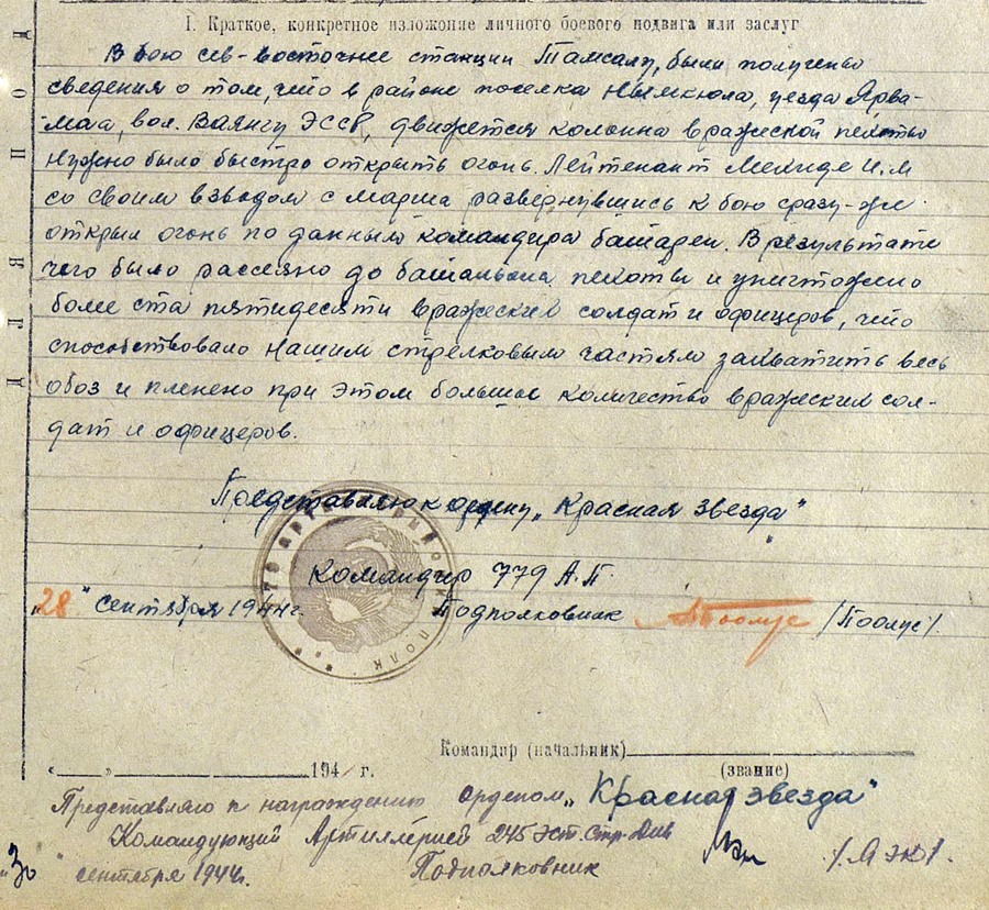 Leitnant Mehide, 249. laskurdiviisi 779. suurtükiväepolk. Kaasas oli ka see tunnistus ja lisaks suuline kinnitus, et on sama mehe omad. Kahjuks ei ole ordeniraamatut ennast.