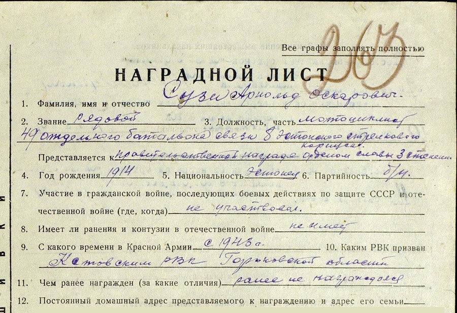 Sai üles korjatud Punatäht numbriga 1309156, mis on väga lähedane Käisi Punatähe ordenile (1309129). Olen üsna kindel, et 1309156 on samuti korpusega seotud.tossom kirjutas:Vanem Käis, 7. Laskurdiviisi 482. Üksiku luureroodu raadiojaama ülem. Punatähe ordeni ja lahinguteenete medali kavaler. Kahjuks saab hetkel näidata põhimõtteliselt ainult dokumente, loodame, et autasud ka päevavalgele ilmuvad.