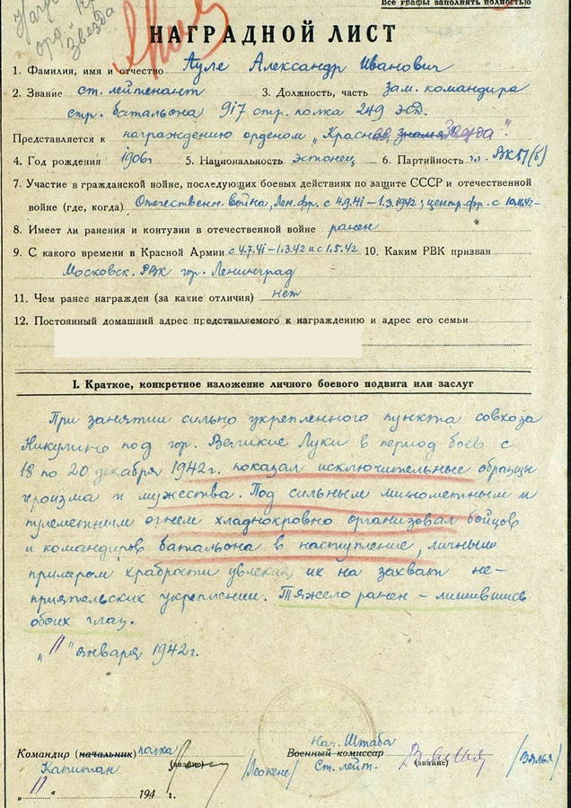 Siin/ seal müügisaitidel vilkunud vanemleitnat Aule autasude komplekt. Autasulehe leidsin ainult varasele Punatähele. 249. laskurdiviis 917. polk