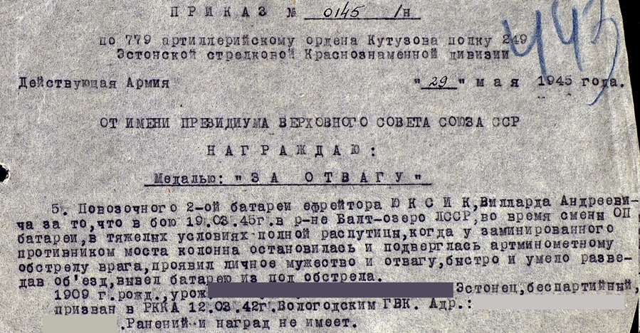 249. Laskurdiviis, 917. Laskurpolk, raadiojaama ülem seersant Endel Vagur. Isamaasõja II klassi ordeni nr. 450529 kavaler.