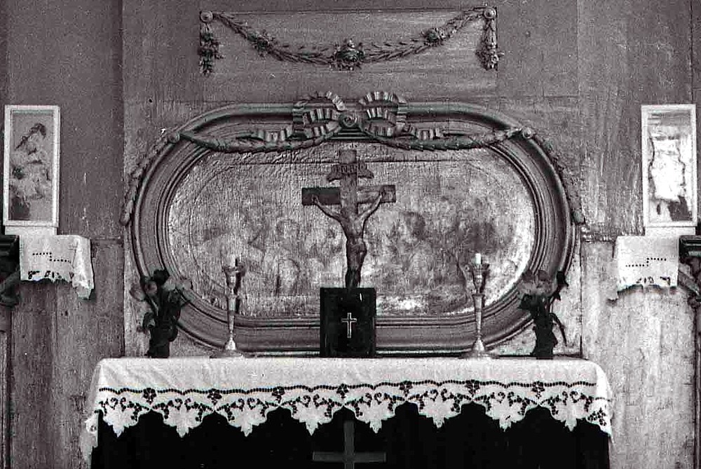 1944. aasta aerofotol on näha raudtee suunast alla jooksev kaitseliin ja all paremal kiriku varemed,