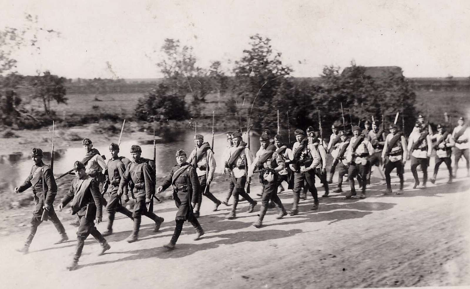 Eks ta Madseni kergekuulipilduja ole, tagumine mees paistab salvekotiga sabas sammuma.