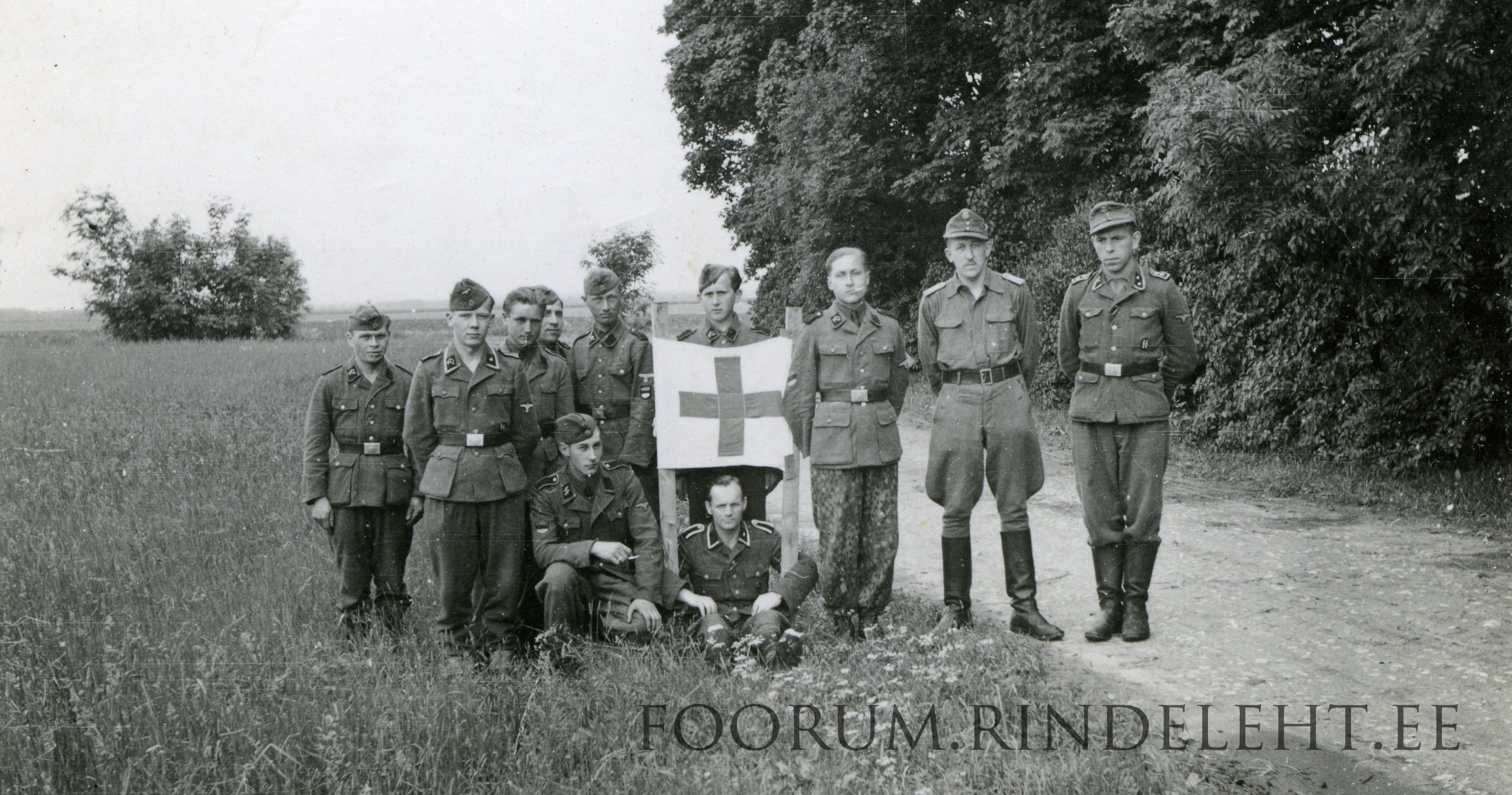 Ülesvõte on tehtud 1944. aasta suvel, juuni lõpus või juuli alguses Anijal, kus paiknes 659. Idapataljonist ja värskelt mobiliseeritutest formeeritud 47. rügemendi I pataljon. Paremalt teine mees on Dr. Hillar Timusk, kes oli pataljoni arst. Tema auaste oli U.Stuf. või O.Stuf - kui Photoshopis seda pilti kruttida siis on näha, et tema õlakutel on mingid vigurid peal aga ei saa aru, kas O.Stuf. tärnid või sanitaarteenistuse ussid. Kogu seltskonna vormiriietus on väga kirju - vähemalt neljal mehel on seljas kuuenööbilised Wehrmacht'i vormikuued, millelt on maha harutatud WH tunnused ning on asendatud Eesti diviisi omadega. Vasakult teine mees on oma rinnatasku alla õmmelnud SS ruunid nagu seda on mõnikord pataljon "Narva" meeste fotodel näha. Kolmandal mehel on varrukalt kotkas puudu. Põlvitaval mehel on paremale varrukale õmmeldud ESTLAND kirjaga Luftwaffe käisekilp, tema taga seisval mehel on varrukal trükitud W-SS varrukakotkas. Sellist tüüpi kotkast on fotodel harva näha aga kuna 1944. aasta suvel ja sügisel tehtud ülesvõtteid on üldse väga vähe säilinud ja kui isegi nendel vähestel see kotkas mõnikord näha on siis tähendab, et neid pidi siin ikka omajagu välja jagatama. Lipu all istuval allohvitseril on nööpaugus 2. klassi Raudristi ja vist Talvelahingud Idas medali lindid, taskul Must Haavatumärk - ilmselt vana Soodeni pataljoni mees. Suitsuga reamehel, kes seisab Timuski kõrval on õlakute värvipael midagi valgest värvist tumedamat - võimalik, et meditsiiniteenistuse sinine ja seega võiks tema olla üks paarist sanitari väljaõppe saanud mehest seal grupis. Kõige rohkem küsimus tekitab paremal servas seisev O.Scha. - tema õlakutel on peale ühe O.Scha. auastet näitava tärni veel mingi vigur. Vasakul varrukal on näha käiselinti ja kui Photoshop appi võtta ja natuke ette kujutada siis võiks seal olla kirjas Hitler ja seega käiselint võiks olla 1. W-SS diviisi "Leibstandarte SS Adolf Hitler" oma. Kui nii siis võiks olla õlakutel LAH'i monogrammid. Sarnaselt vasakult teise mehega on ka temal vasaku tasku all ruunid, mida eeskirjade järgi kasutasid sakslased siis kui olid määratud välismaalastest formeeritud üksuse koosseisu. Aga võimalik, et mõlemad mehed on ruunimärgid õmmelnud edevusest, O.Scha. õlakutel on hoopis näiteks "20" nagu 20. Eesti diviis ja varrukalint on mingi kodukootud variant.